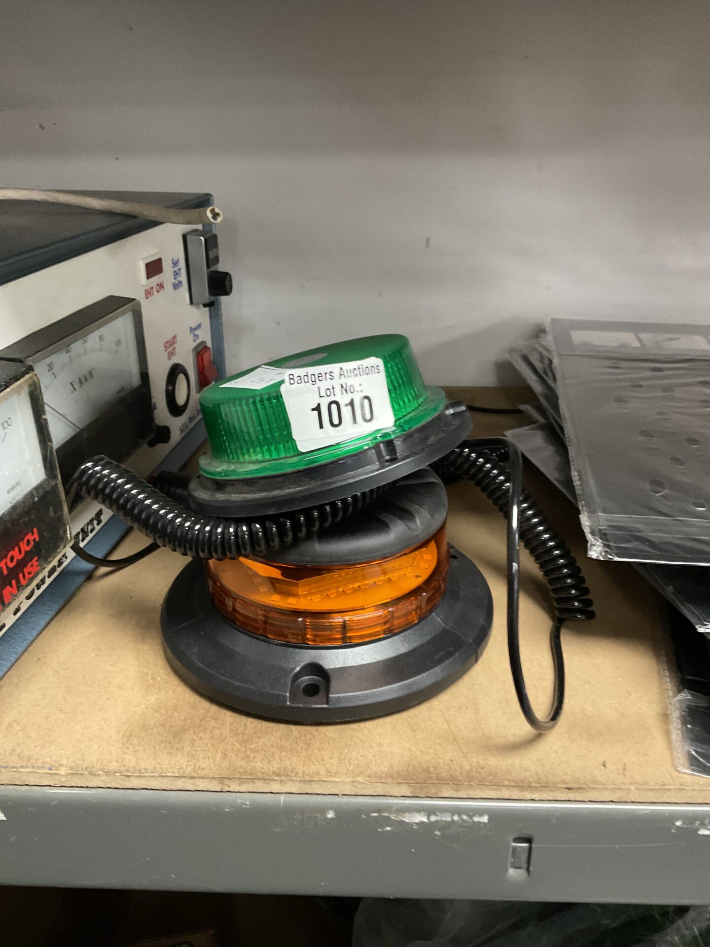 This beacon light features both green and amber lenses, designed for 12v dc operation. The circular base allows for versatile mounting options, and the rotating lens provides a clear warning signal. This type of beacon is commonly found on vehicles and equipment requiring increased visibility.