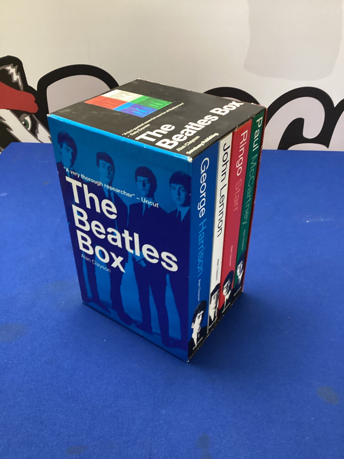 The books appear to be in vintage condition, showing signs of age and handling. While the box shows wear, the books themselves appear structurally sound. This collection would be of interest to Beatles enthusiasts, music historians, and collectors of biographical literature, offering a detailed look into the lives and careers of the band members.