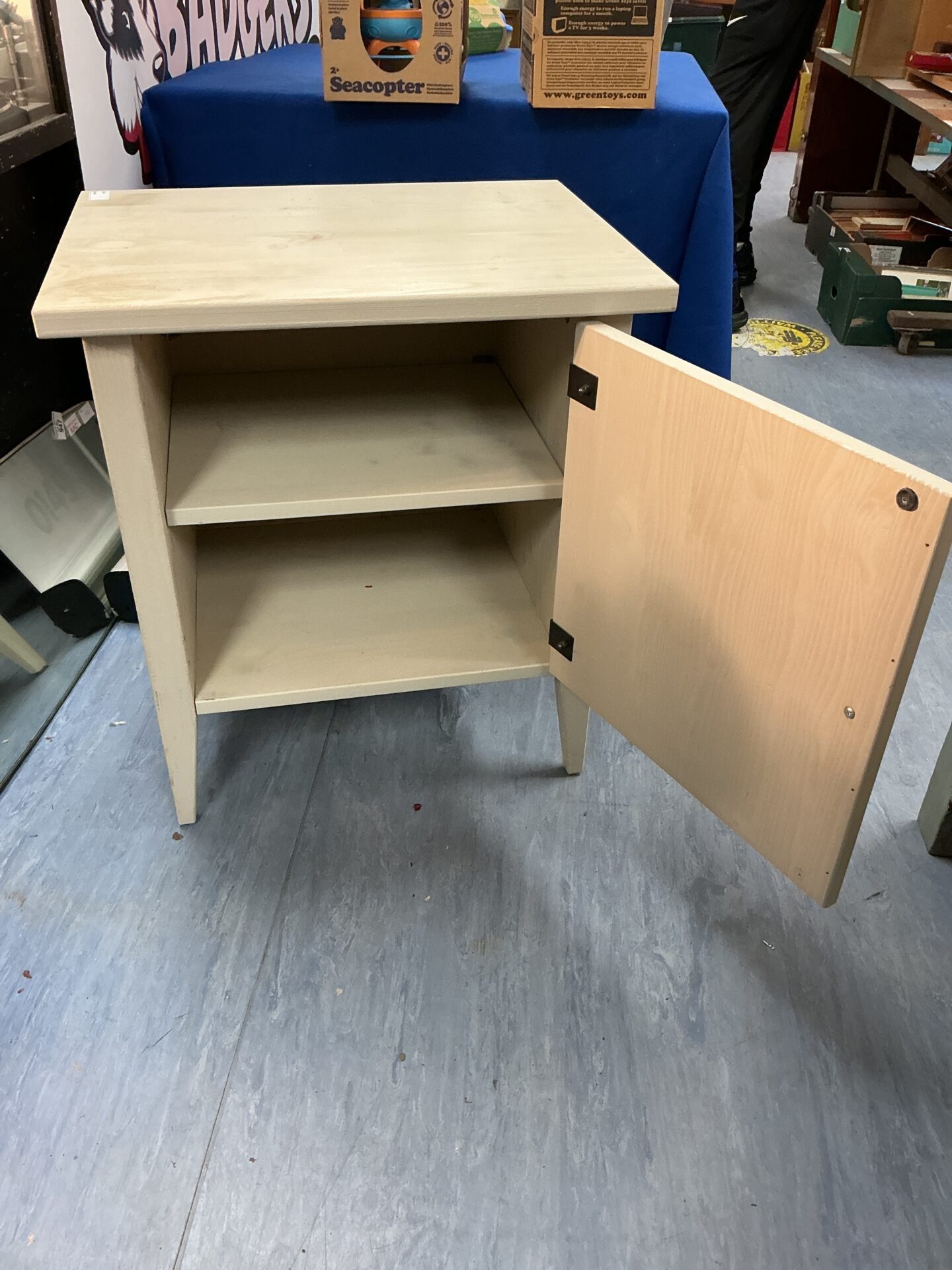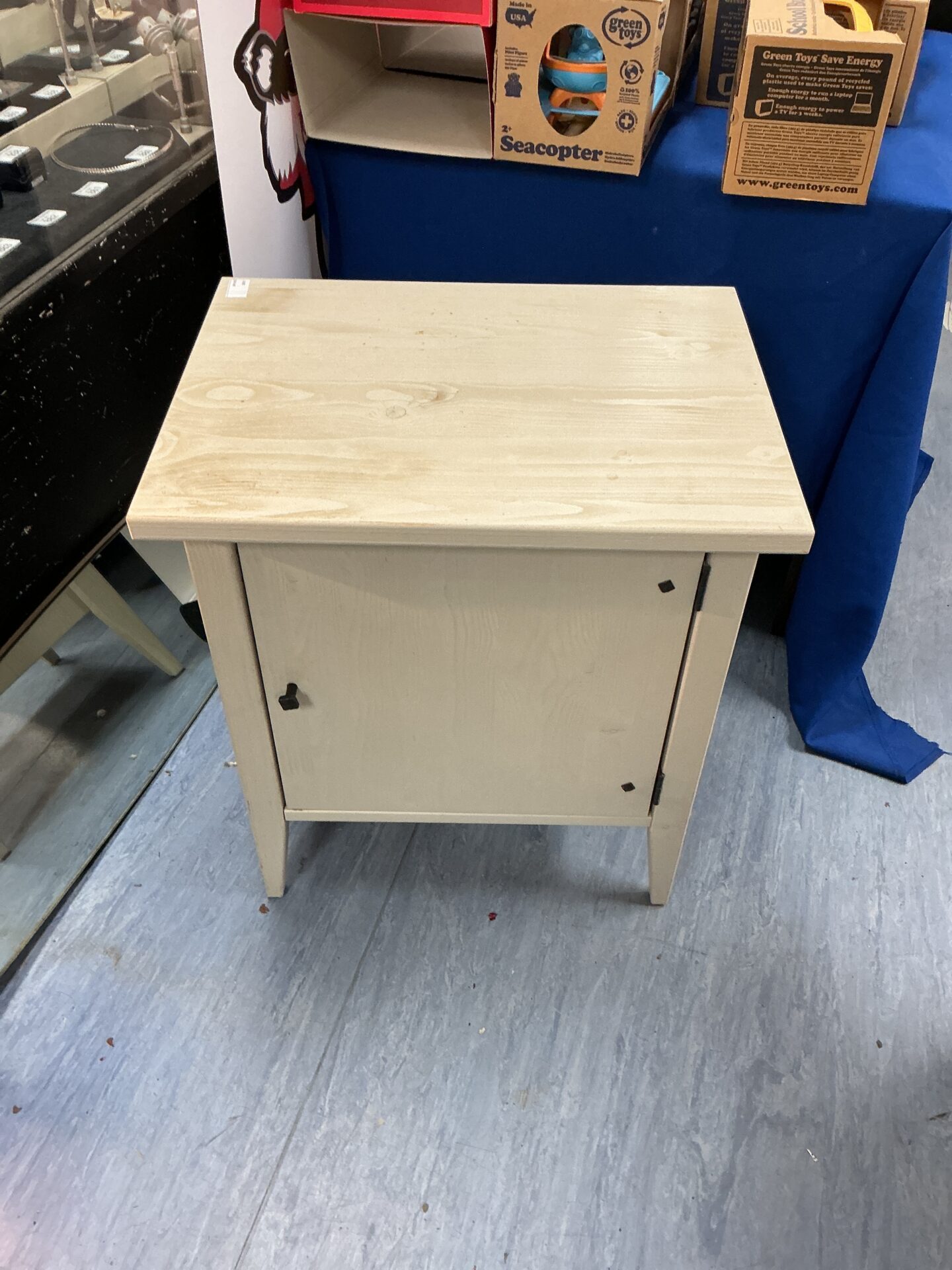 This is a small, wooden bedside cabinet, measuring approximately 22”x16”x24”. The cabinet features a single door and offers enclosed storage space. Its simple design and light wood finish would suit a variety of bedroom decor styles.