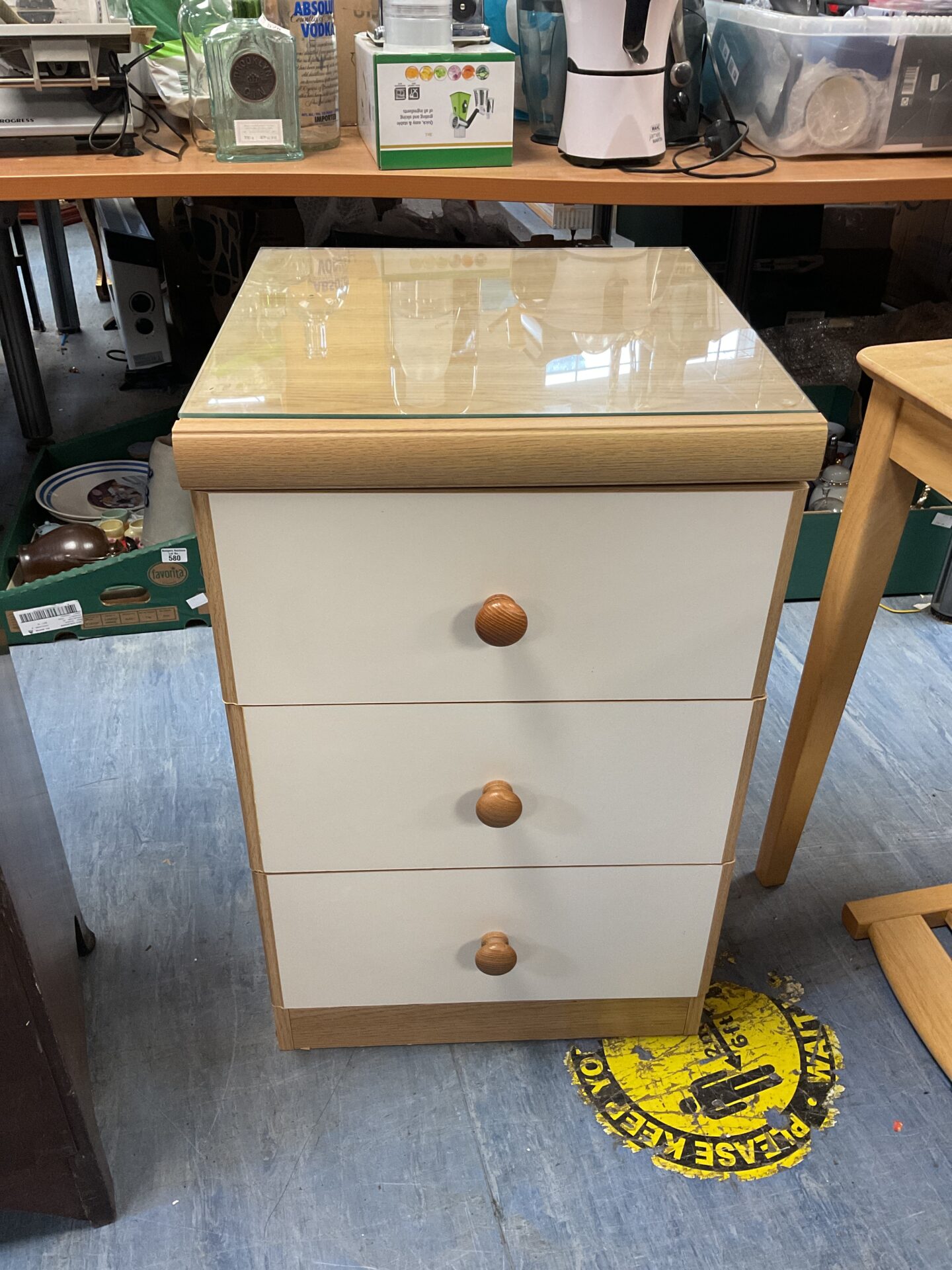 This is a three-drawer bedside cabinet constructed with a beech effect finish. The cabinet offers practical storage with its three drawers, making it ideal for bedroom use. Its simple design and neutral colour would suit a variety of interior styles.