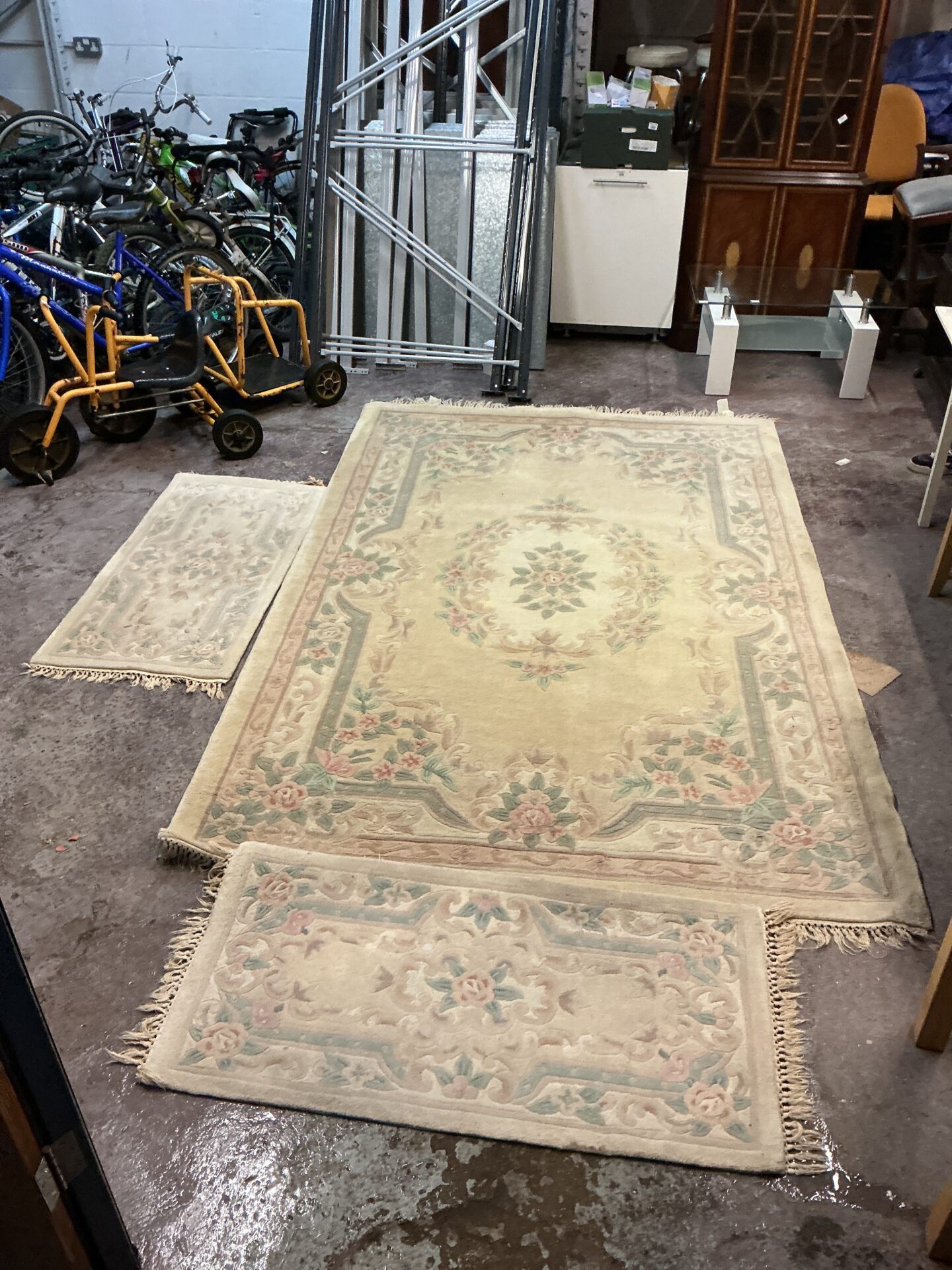 This lot features a beige rug set, comprising one larger rug measuring approximately 9’x6’ and two smaller coordinating rugs. The rugs exhibit a floral pattern with muted tones, suggesting a vintage or traditional style. The larger rug serves as a focal point, while the smaller rugs can be used to complement the space or define smaller areas within a room.