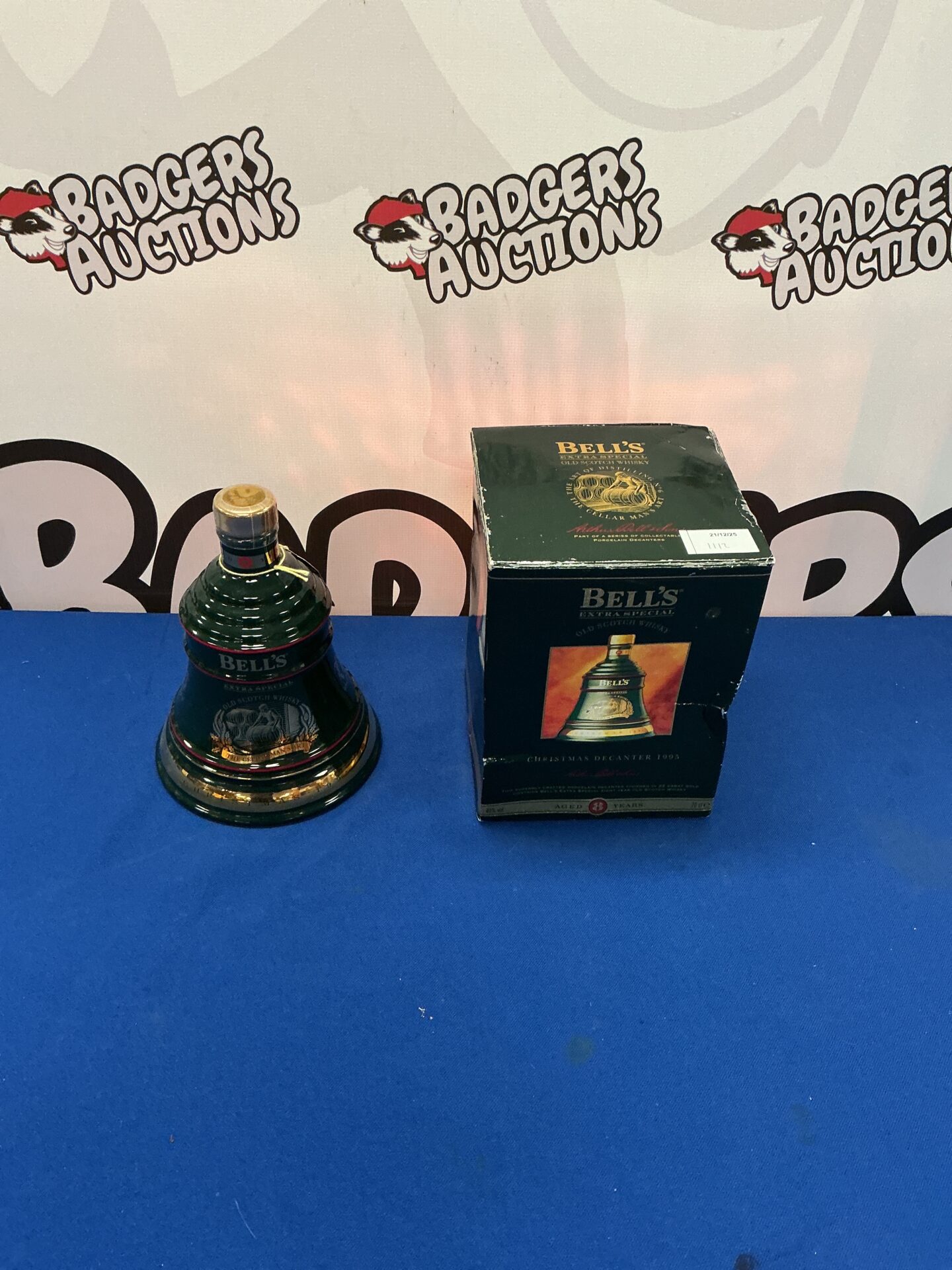 This is a sealed Bells Whisky Christmas Decanter from 1995. The decanter features a festive design, typical of the annual series released by Bells. It is a classic collectible item for whisky enthusiasts and collectors of seasonal memorabilia. The decanter is intended for display and collecting, and is a representation of a popular tradition.