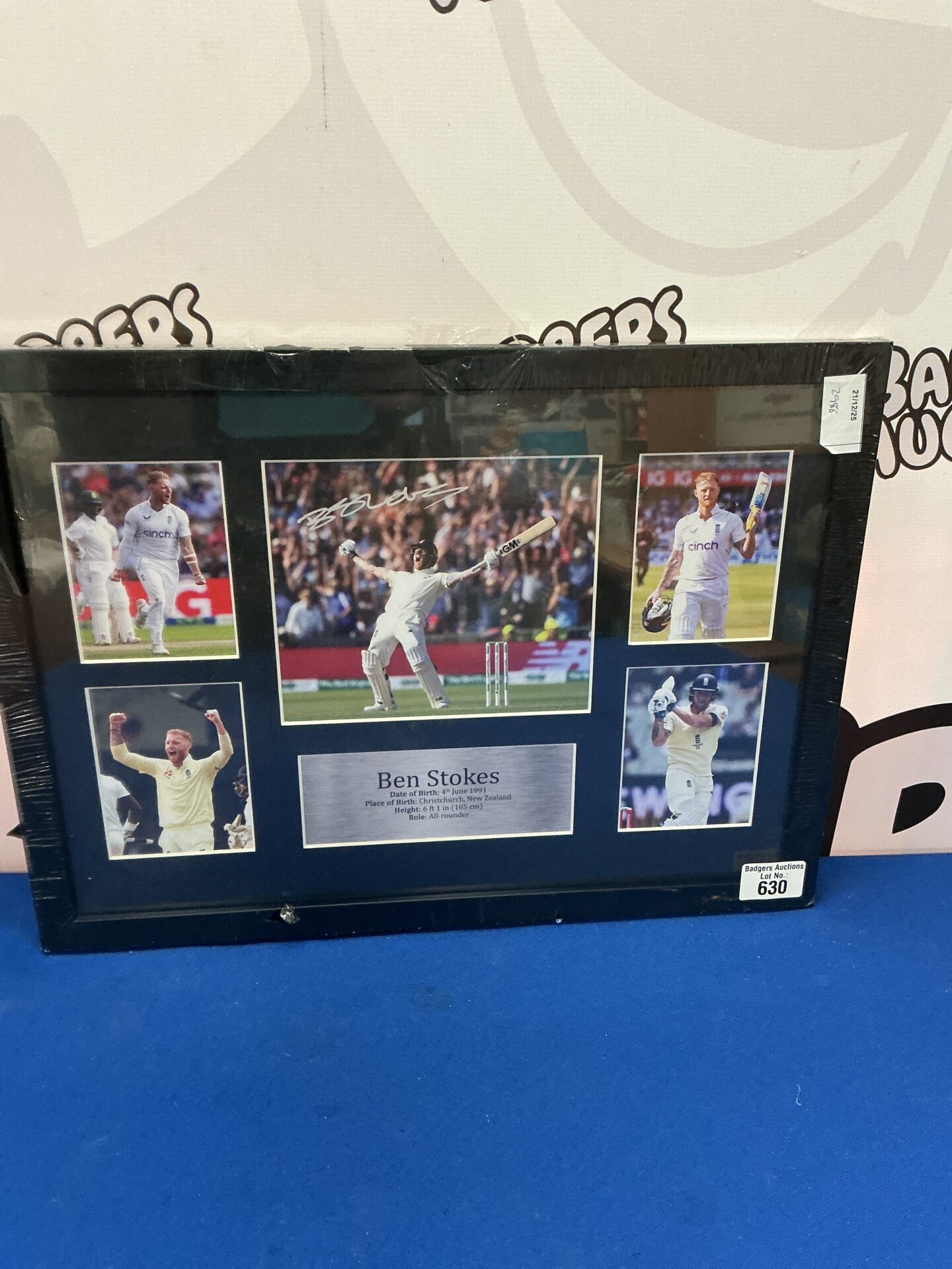 This is a framed print featuring Ben Stokes, a prominent figure in England cricket. The print showcases Stokes in action on the field, and is accompanied by his signature, adding to its collectibility. The frame enhances the presentation, making it suitable for display in a home, office, or sports-themed room.