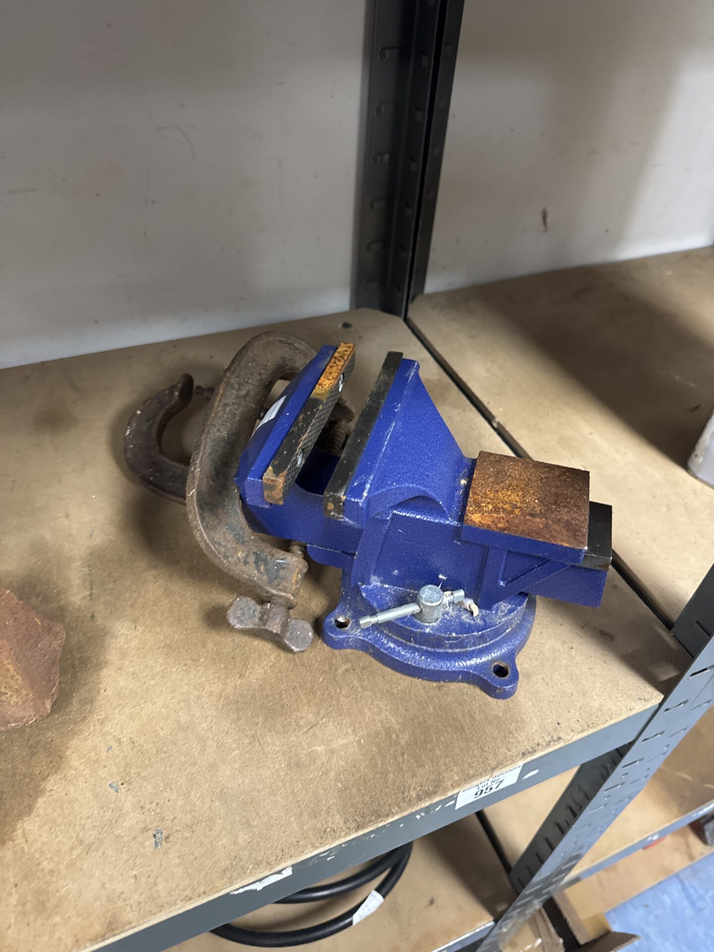 This is a small bench vice, constructed from cast metal with a blue painted finish. It features two G clamps for securing workpieces. The vice is designed for light-duty tasks and would have been commonly found in workshops or for hobbyist use.
