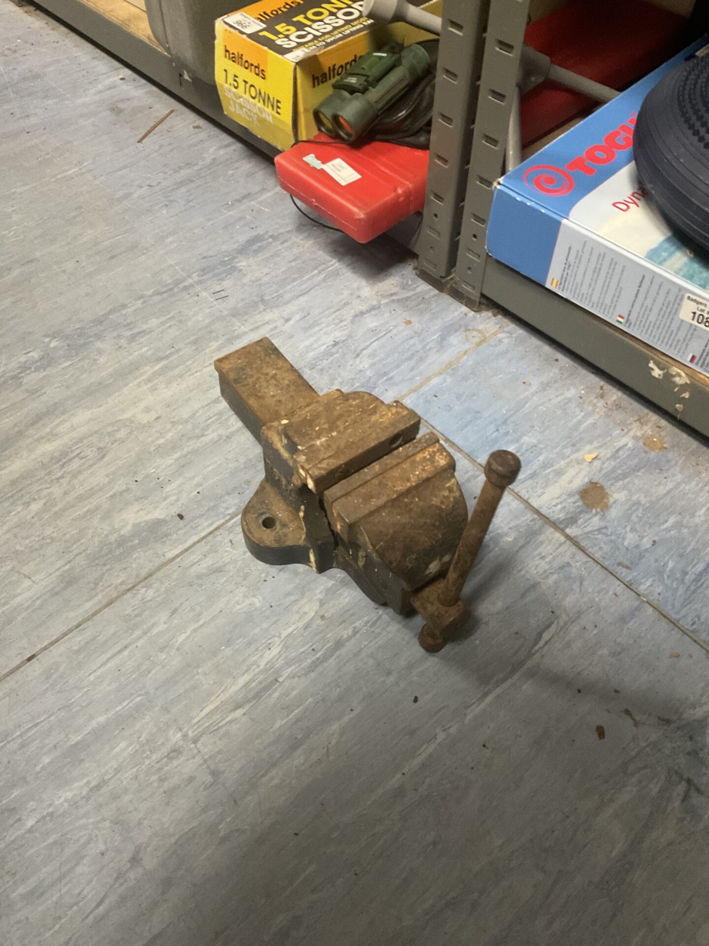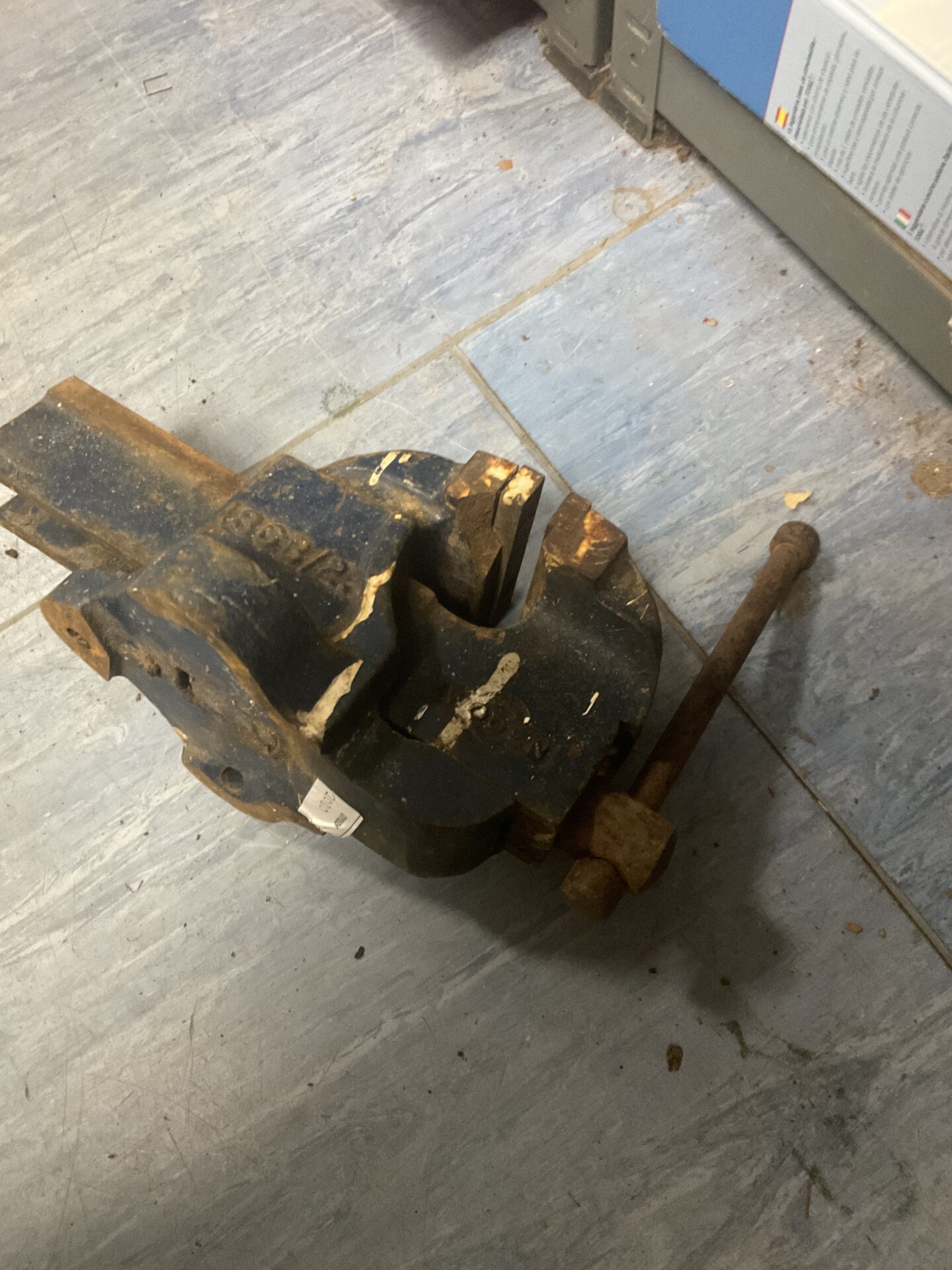 This bench vice shows signs of previous use and has some damage to one of the jaws, as is typical for a tool of this age. Despite this, it remains a functional and potentially restorable piece. It would be of interest to collectors of vintage tools, those restoring workshops, or anyone needing a sturdy, reliable vice for their projects.