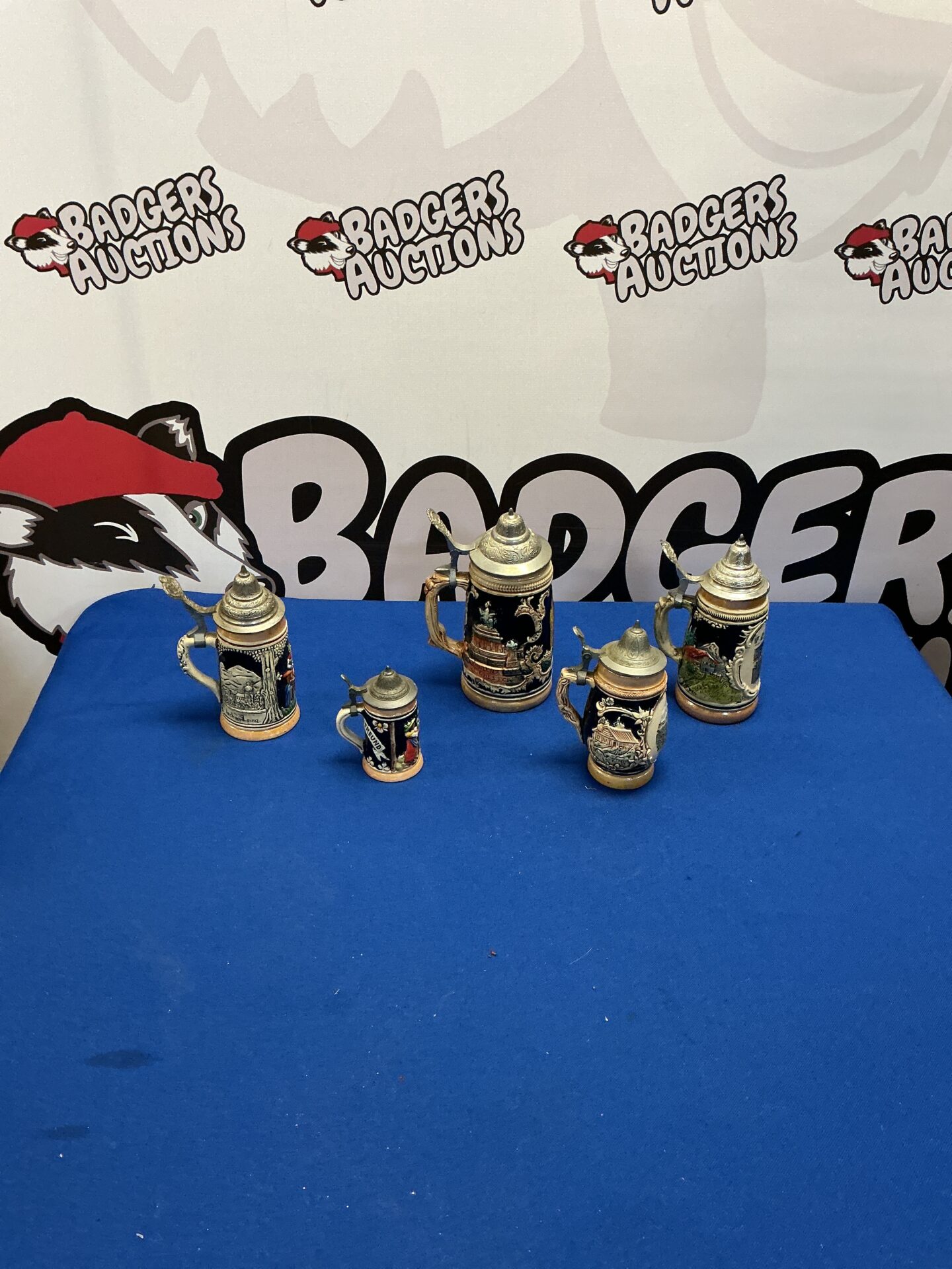These steins appear to be vintage or antique, exhibiting signs of age and wear consistent with their history. While the steins are not assessed for functionality, they present as desirable collectibles for enthusiasts of German culture, beer memorabilia, or vintage ceramics. Their unique designs and potential historical significance make them interesting pieces for display or addition to a collection.