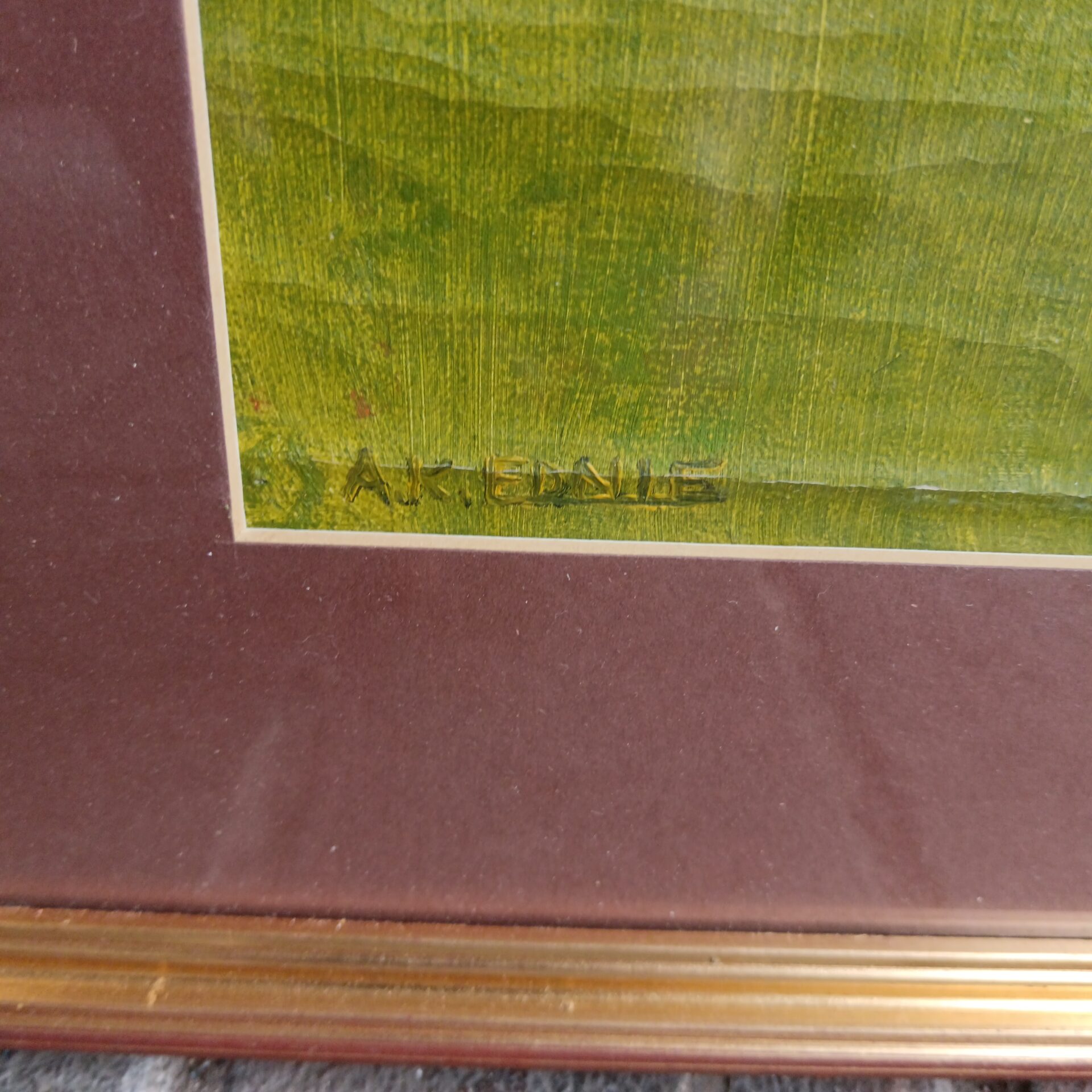 The painting appears to be in good vintage condition, with expected signs of age and wear consistent with its period. There are minor imperfections to the canvas and frame, which contribute to its character and authenticity. This piece would be a wonderful addition to a collection of botanical art or vintage paintings, appealing to collectors and enthusiasts alike who appreciate unique and charming artworks.