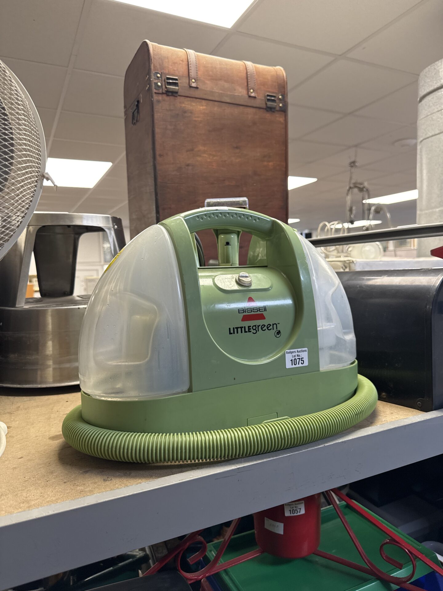 This is a Bissell Little Green portable spot and stain cleaner, model 339A. This compact and lightweight appliance is designed for quick and easy cleaning of carpets, upholstery, and other surfaces. Its powerful suction and cleaning solution effectively remove dirt, stains, and odors, making it ideal for pet owners, families with children, or anyone who wants to keep their home clean and fresh.