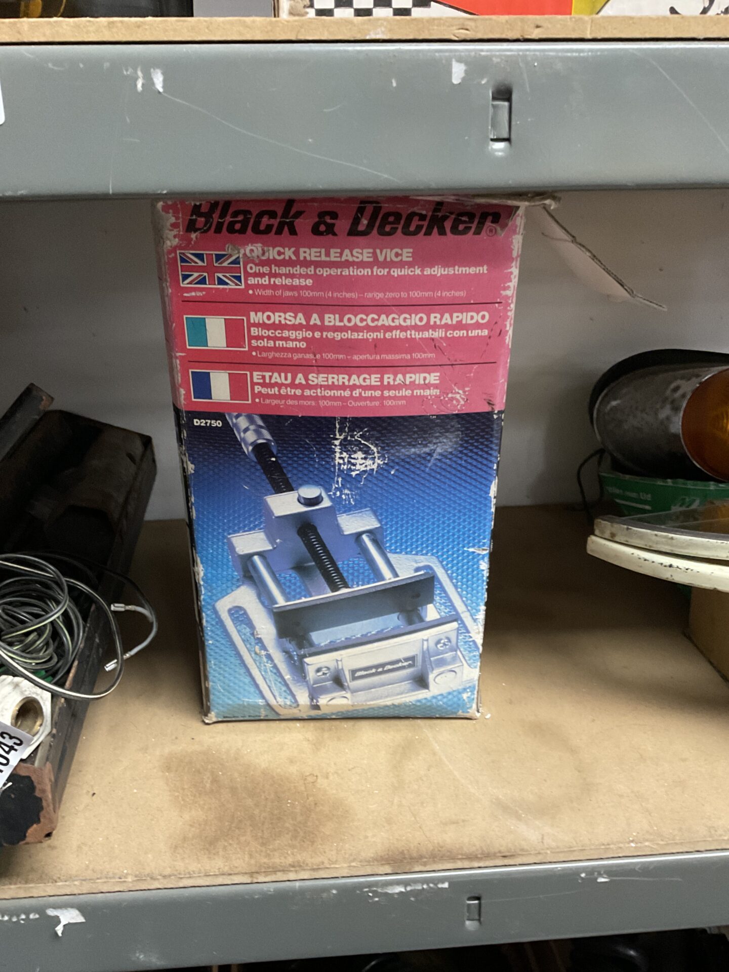 This Black & Decker vice appears to be in used condition, with signs of wear consistent with age and previous use. It may exhibit surface rust, scratches, or other cosmetic imperfections. Despite this, the vice remains structurally sound and functional. It would be a welcome addition to a tool collection, or suitable for restoration and use in a workshop setting.