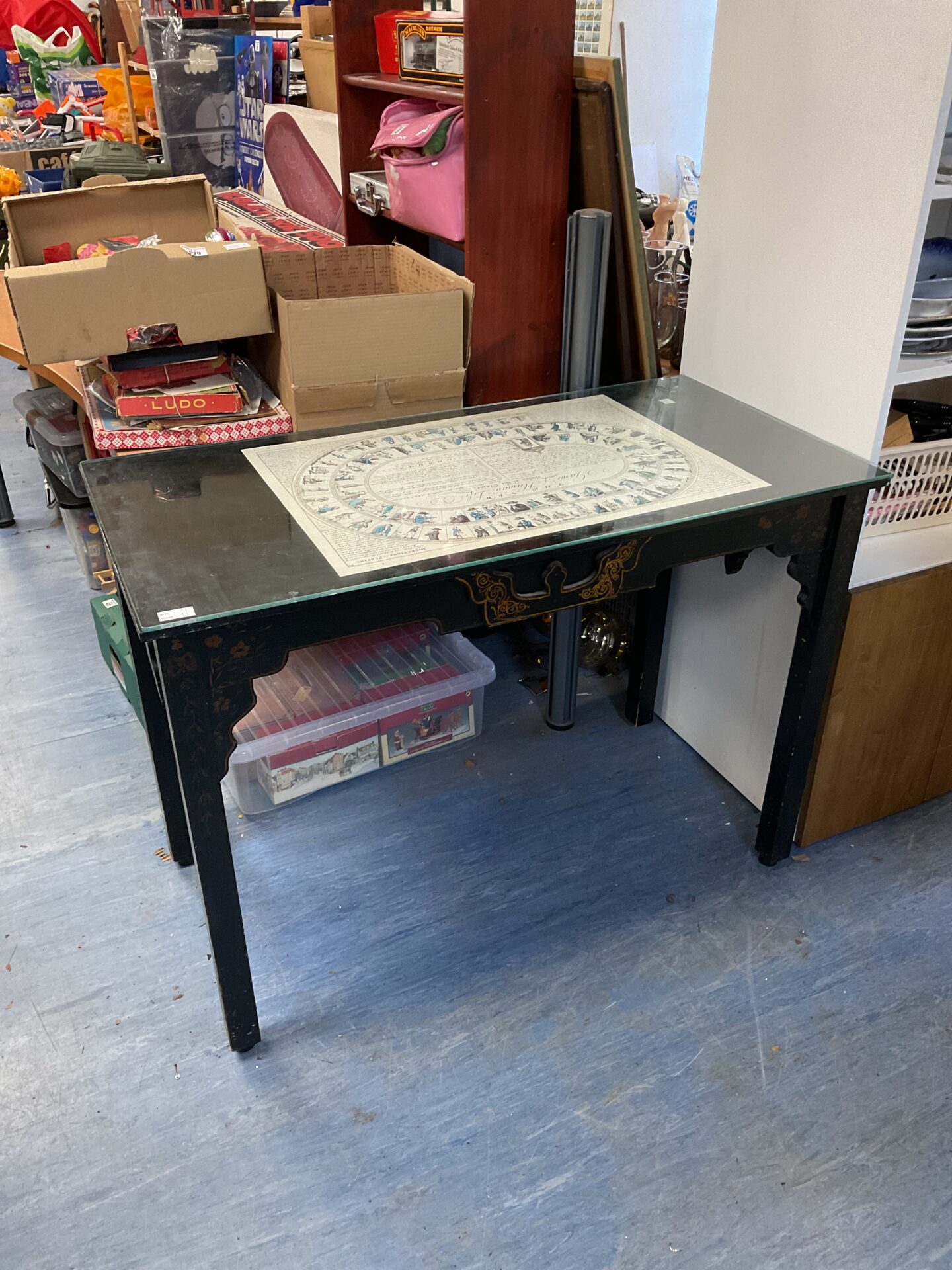 This is a black lacquered desk featuring intricate gold painted details and a glass top. The desk exhibits Asian-inspired design elements, with a traditional form and decorative motifs. The combination of the dark lacquer and gold accents creates a striking contrast, while the glass top adds a modern touch.