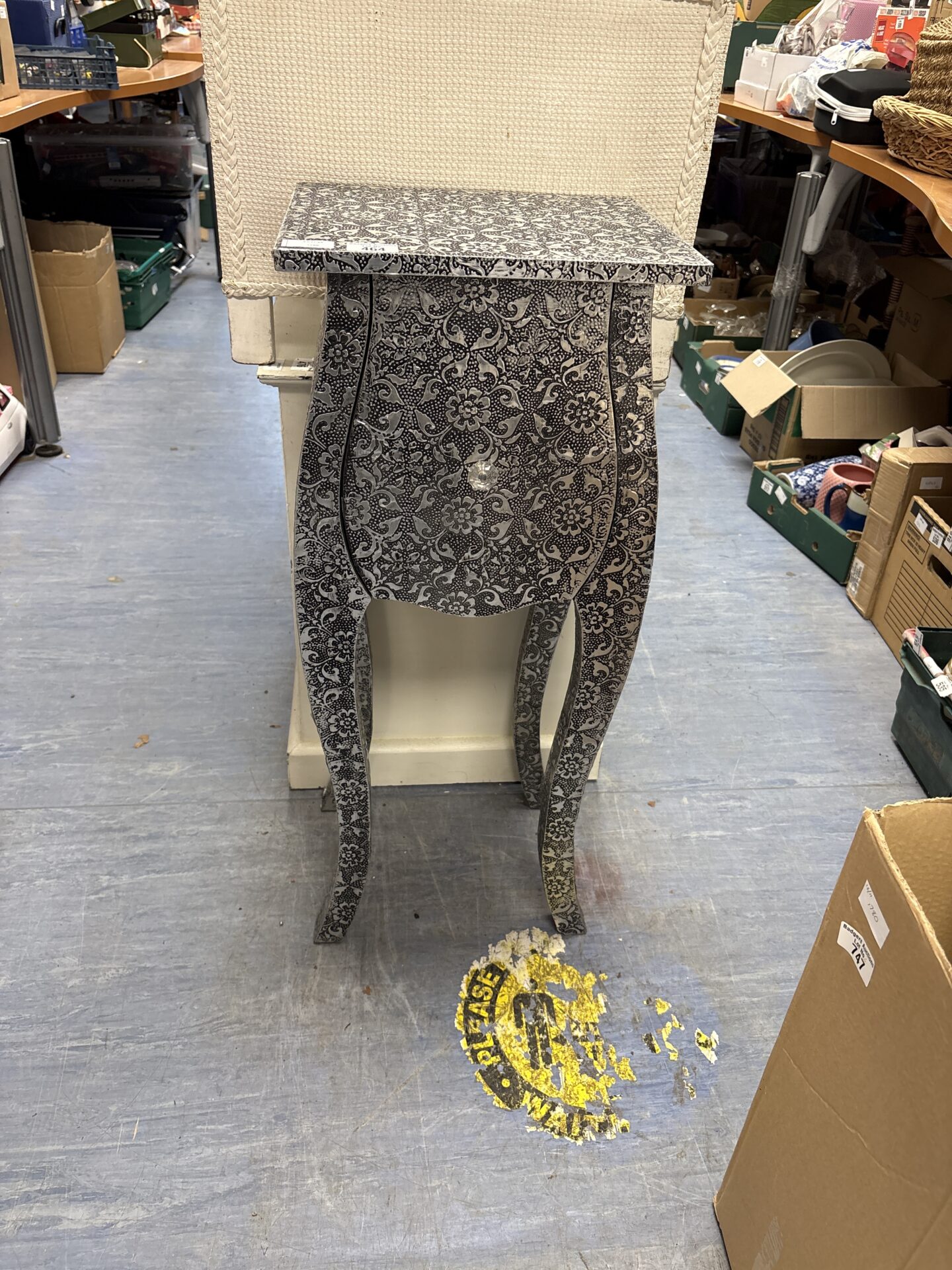 This striking bedside cabinet features a blackened metal frame intricately embossed with a scrolling silver design. The cabinet’s form is reminiscent of Victorian-era furniture, with a slender, elegant silhouette and a single drawer offering concealed storage. The detailed metalwork and unique design make this piece a standout decorative item, suitable for a bedroom, hallway, or as a statement piece in any room.