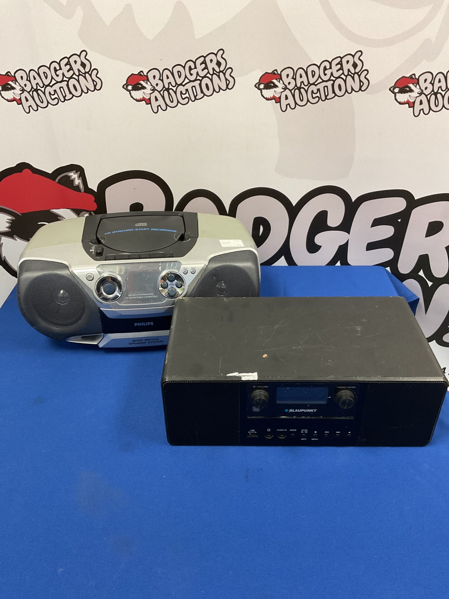 The condition of both units appears consistent with age and use. While details are limited by the image, there are visible signs of wear. This lot may appeal to collectors of vintage audio equipment, enthusiasts of both Blaupunkt and Philips brands, or those seeking a unique and functional stereo system for home or portable use.