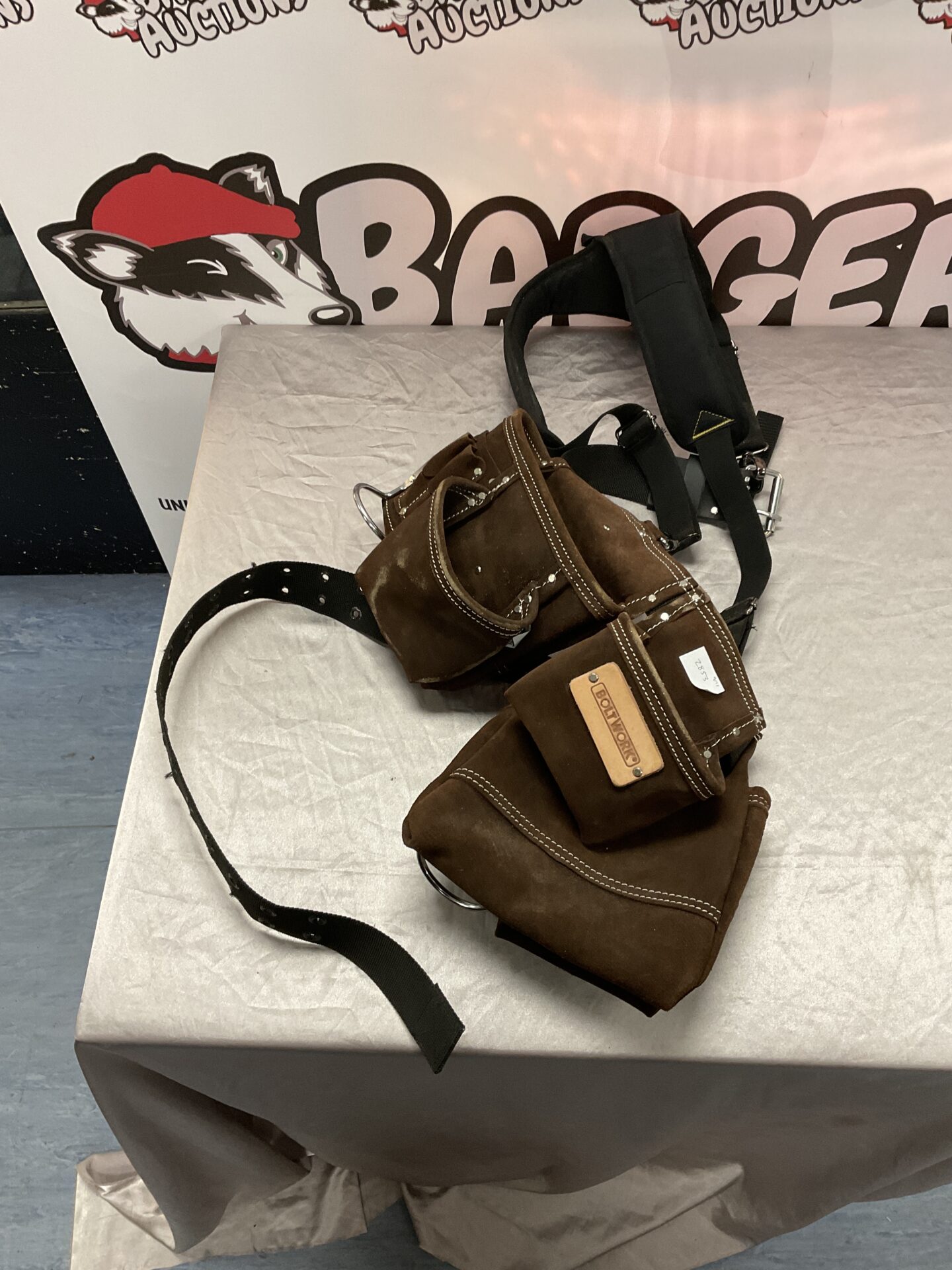 This Boltwork tool harness shows signs of wear consistent with age and use. The leather exhibits a desirable patina, adding to its vintage character. This harness would be a great addition to a tool collection or for someone seeking a functional and well-worn piece of workwear.
