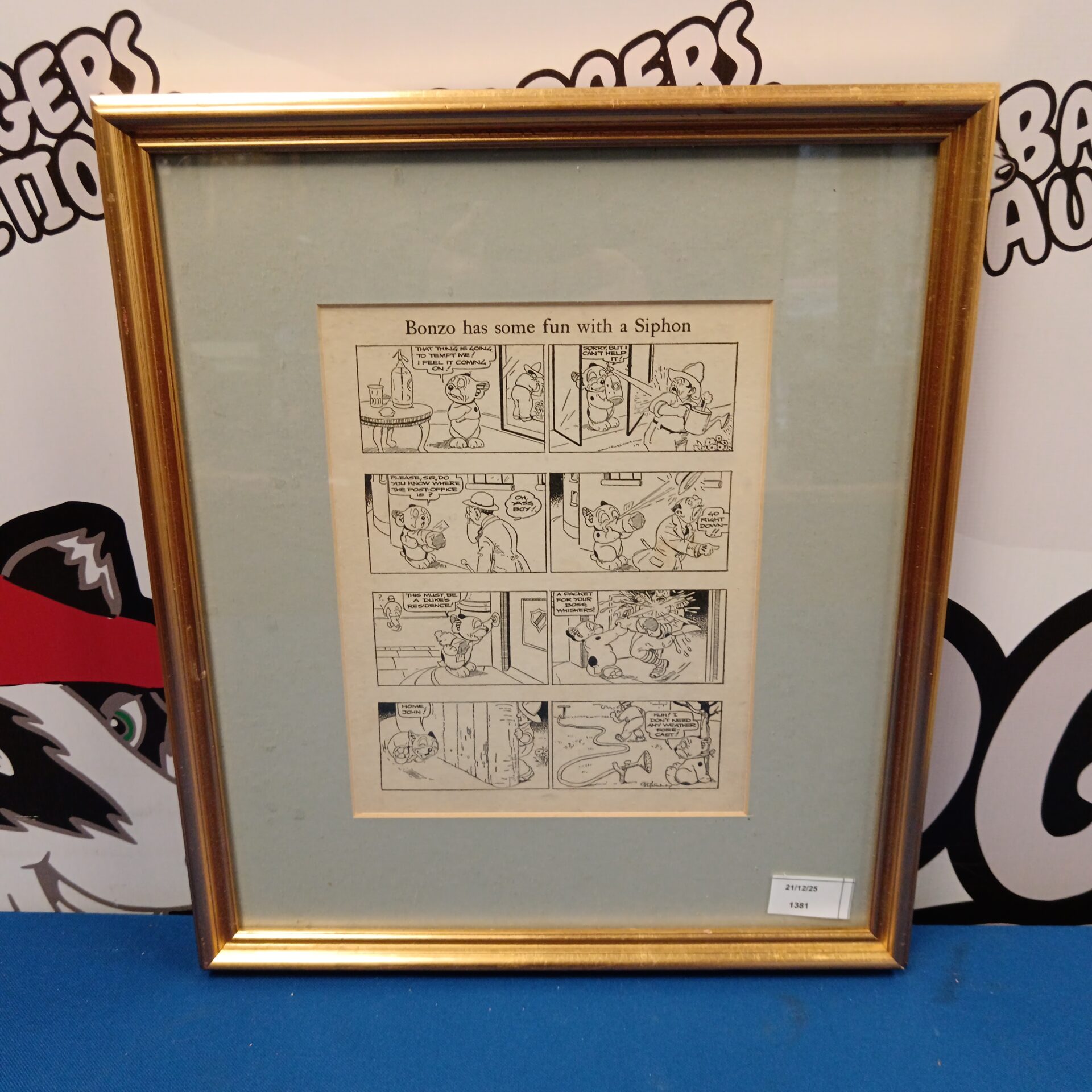 The cartoon shows signs of age and wear, consistent with its vintage nature. It presents well and would be a wonderful addition to a collection of vintage cartoons, British art, or memorabilia related to Bonzo the dog. Collectors and enthusiasts will appreciate its historical significance and charming aesthetic.