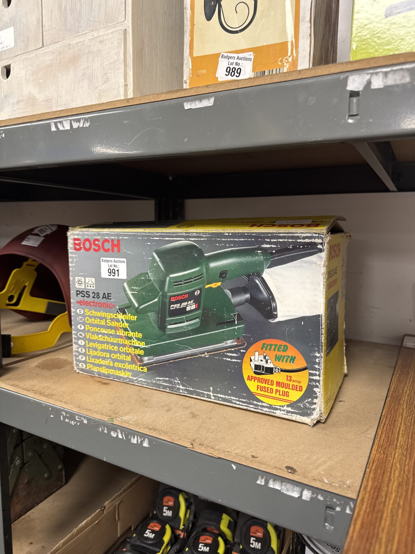 This is a Bosch PSS 28 AE electric sander, a versatile tool for a variety of sanding applications. It features a robust motor and a comfortable grip, designed for both home and professional use. The sander is intended for smoothing, shaping, and finishing wood, metal, and plastic surfaces, offering a balance of power and control for detailed work.