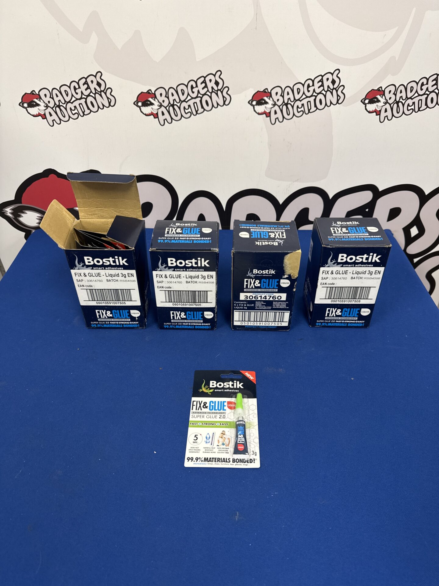 This lot comprises four boxes of Bostik Fix & Glue, a popular superglue designed for a wide range of household and DIY tasks. Each box contains multiple tubes of this fast-acting adhesive, known for its strong bond on various materials including wood, plastic, rubber, and metal. The Fix & Glue formula is designed for quick repairs and bonding, making it a useful addition to any toolkit.