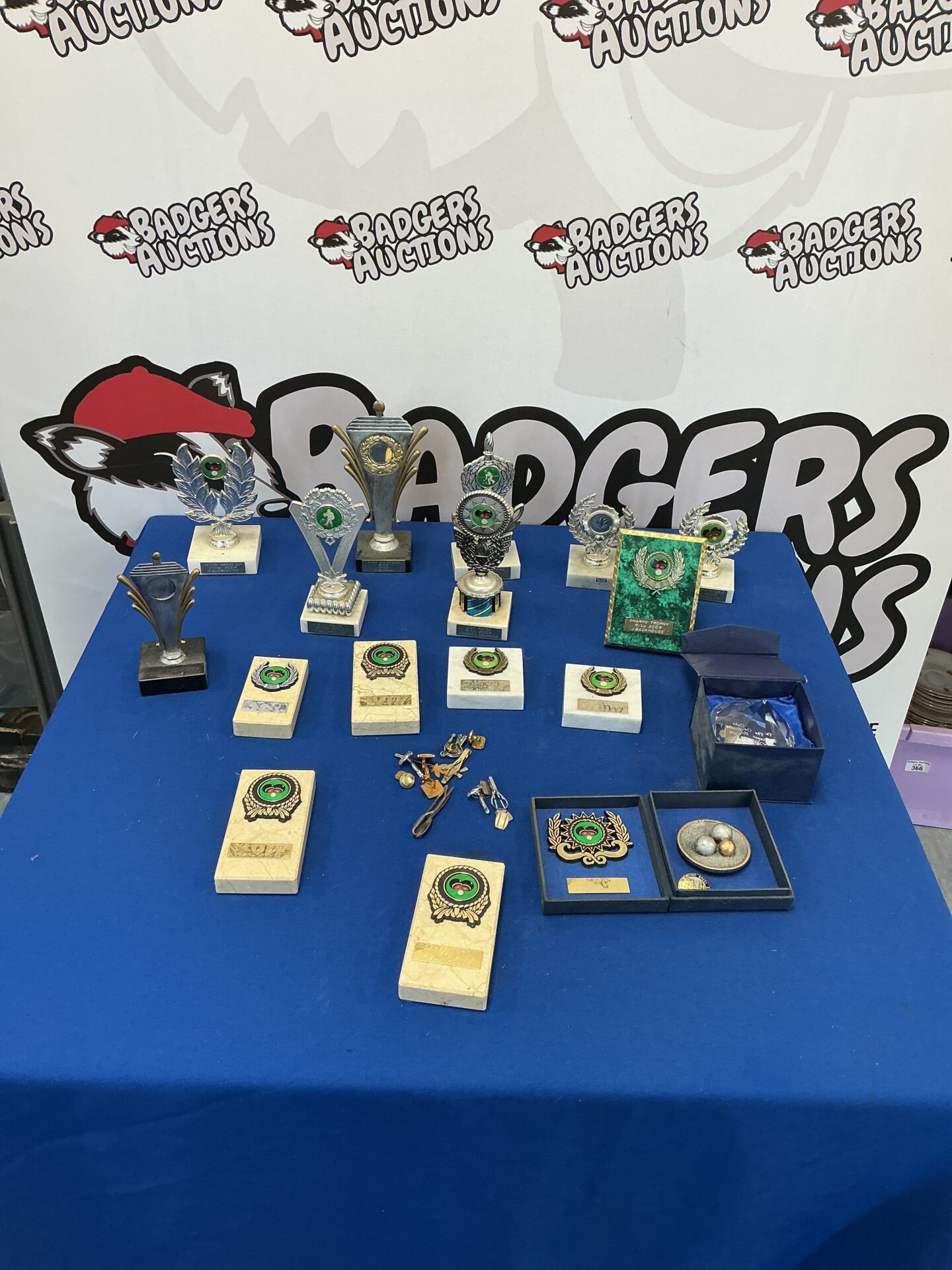This lot features a collection of bowls trophies and medals, representing achievements in competitive play or club events. The awards showcase a variety of designs and materials, offering a glimpse into the history of a bowls club or individual player. A charming vintage collection for collectors or enthusiasts.