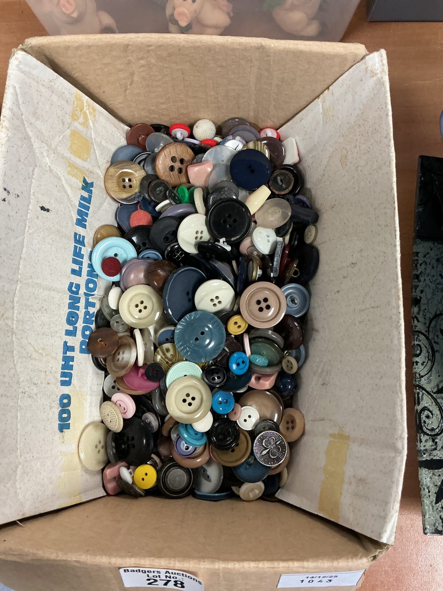 This lot comprises a diverse collection of buttons, offering a wide range of colours, sizes, and materials. The buttons appear to be a mix of plastic, glass, and potentially some metal, suggesting they have been accumulated over time from various garments and projects. This assortment would be ideal for crafters, seamstresses, or collectors looking to add to their button stash.