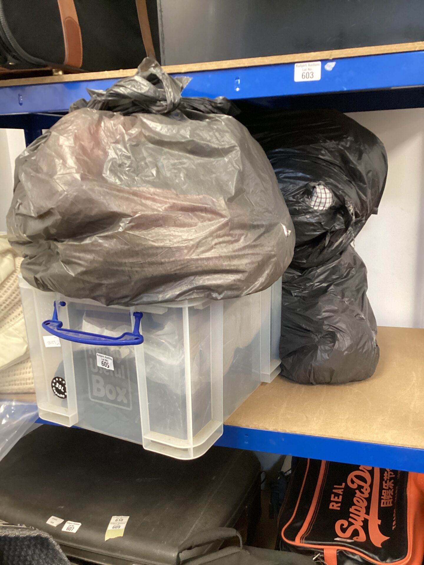 605 Box & Three Bin Bag Full Of Clothing