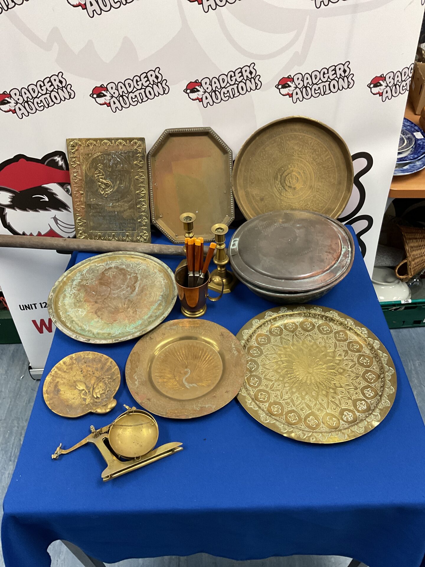 This lot comprises a collection of antique brass and copper items, showcasing a variety of forms and uses. Included are several decorative dishes, a copper pan, and notably, a vintage bedpan, adding a unique historical element to the collection. The lot also features an Art Nouveau style dish, displaying the flowing lines and organic motifs characteristic of the period.