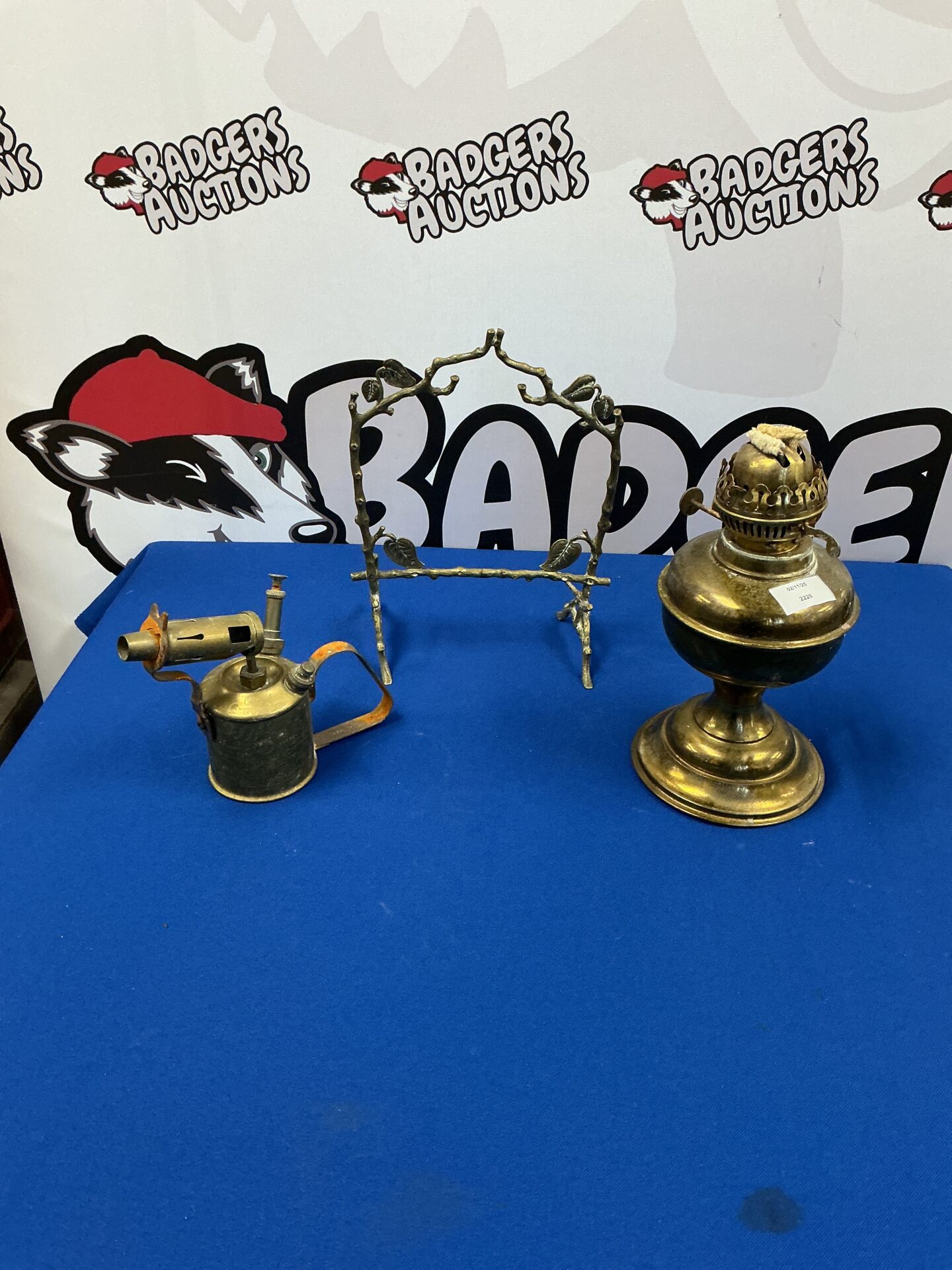 This is a vintage brass blow torch lamp, featuring a classic design with a sturdy base and adjustable nozzle. The lamp’s construction suggests it was originally used for heating or lighting purposes, likely in a workshop or outdoor setting. The brass construction gives it a warm, antique appearance, and the adjustable nozzle allows for focused heat or light.