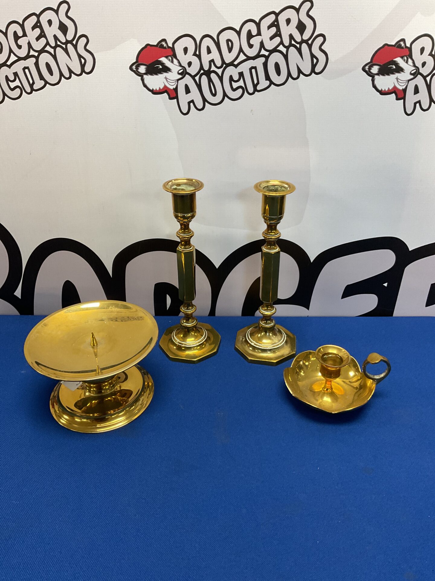 This charming set comprises a pair of elegant brass candlesticks and a matching chamber stick. The candlesticks feature a classic, gently tapering form with a circular base, providing stability and a timeless aesthetic. The chamber stick, designed for holding a candle while moving or for bedside use, complements the candlesticks beautifully, sharing the same warm brass tone and refined detailing. This set would have been a staple in many homes, providing both functional lighting and a touch of sophistication.