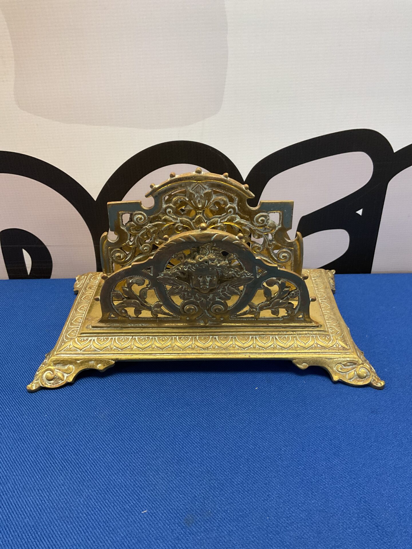 This charming letter rack is crafted from brass and features delightful cherub figures adorning the front. The design evokes a Victorian aesthetic, with intricate detailing and a classic form. This piece would have originally served as a functional desk accessory for holding correspondence, but now stands as a beautiful decorative item, perfect for adding a touch of vintage charm to any space.