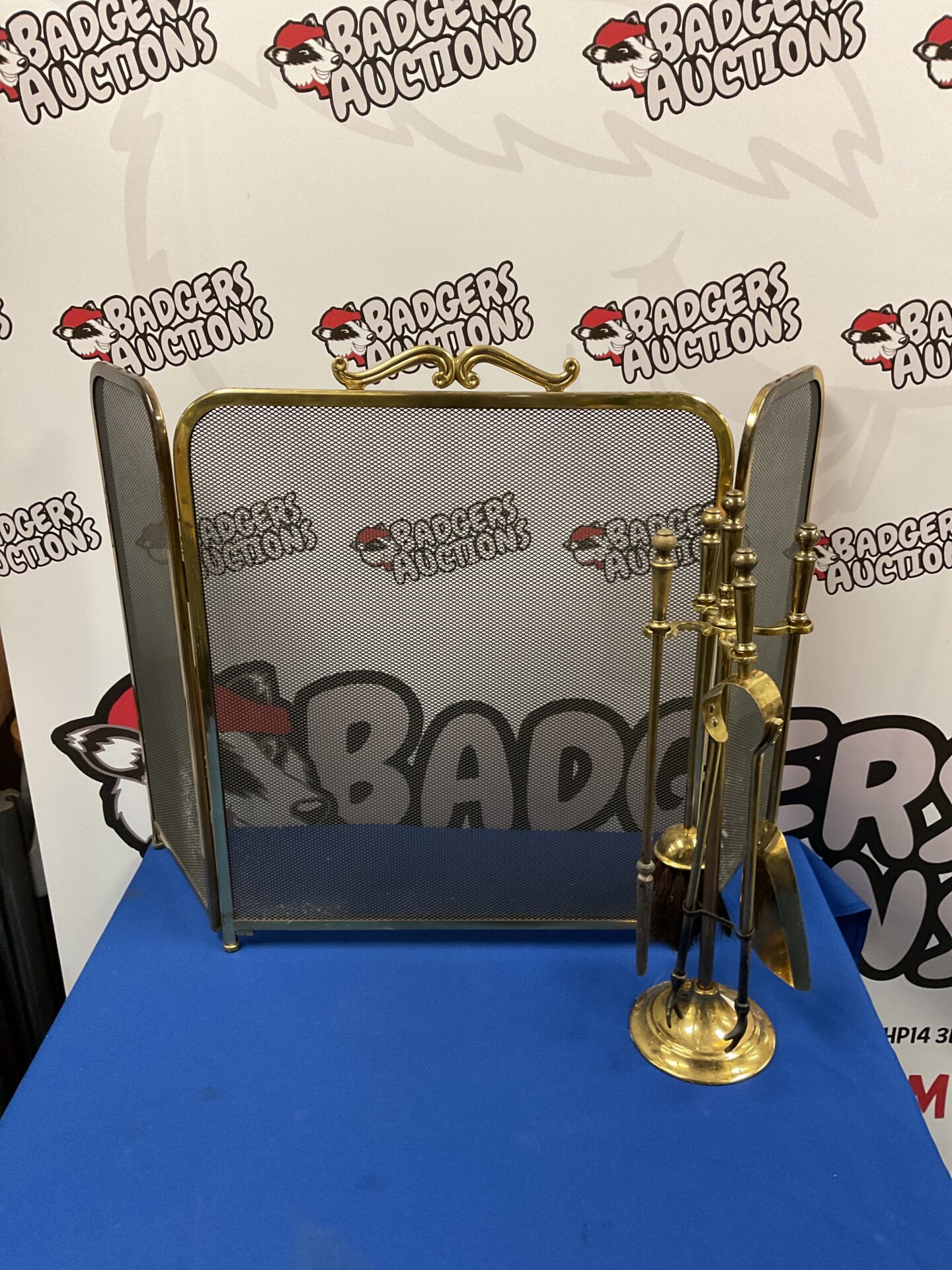This is a vintage brass fireplace companion set, featuring a firescreen and accompanying tools. The set includes a shovel, poker, tongs, and brush, all crafted from brass with decorative handles. The firescreen features an ornate design and is intended to provide a barrier against sparks and embers while allowing visibility of the fire.