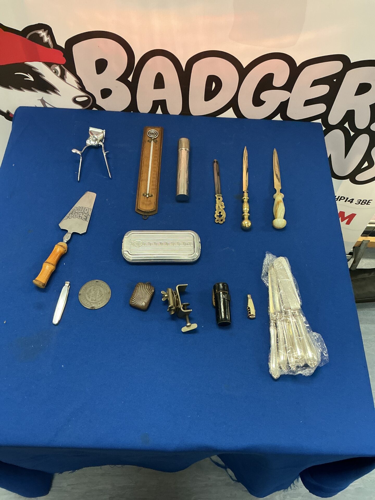 This lot features a brass letter opener with a decorative handle, alongside a collection of other small items. The letter opener exhibits a classic design, suggesting it was intended for use in a professional or home office setting. The other items within the lot appear to be a varied assortment of curios, adding to the eclectic nature of the collection.