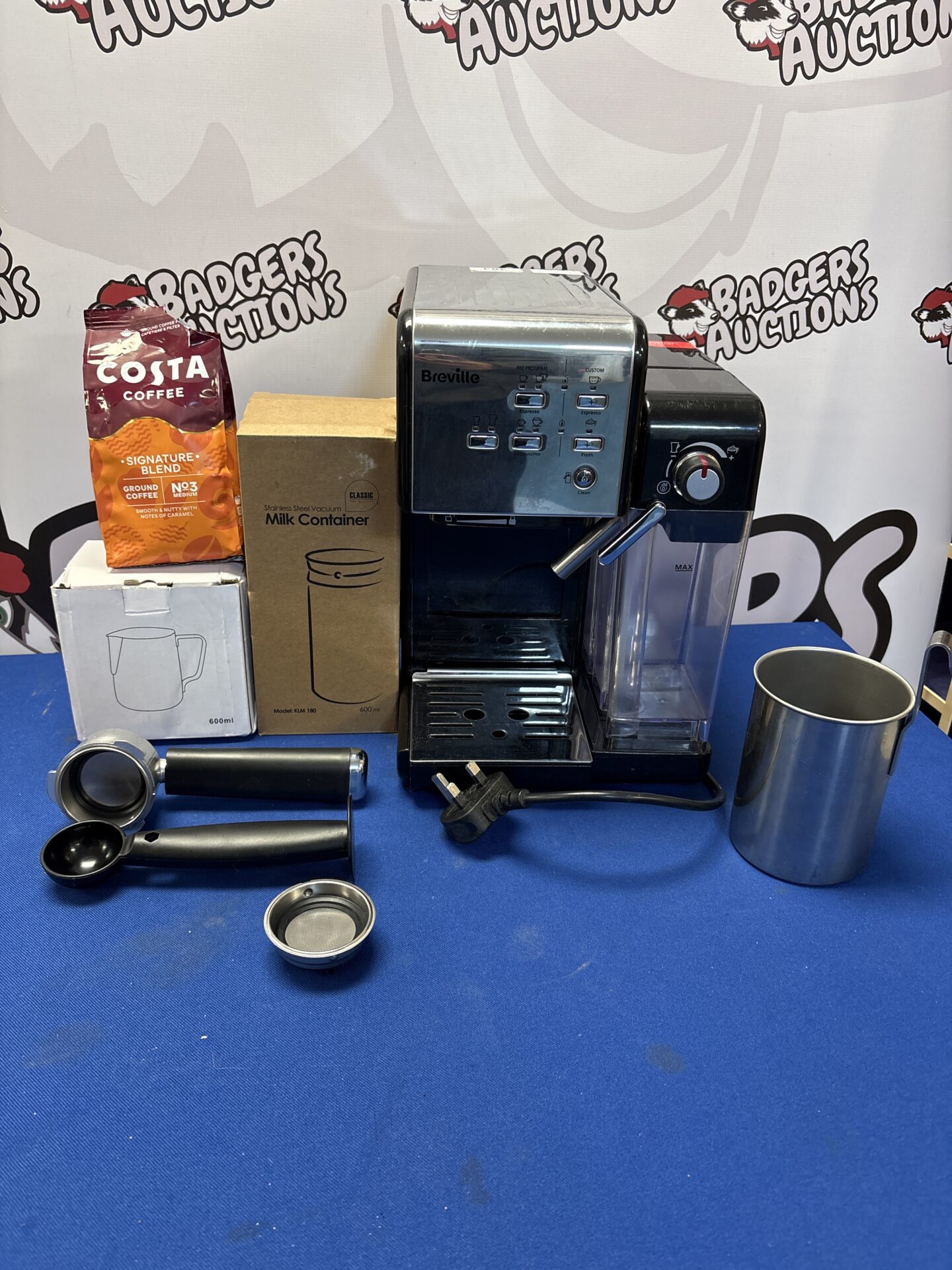 This is a Breville One-Touch CoffeeHouse coffee machine, designed for convenient home brewing. It features a classic milk container for creating cappuccinos and lattes, and is accompanied by a bag of Costa coffee. The machine’s sleek design and user-friendly interface make it a stylish and practical addition to any kitchen.