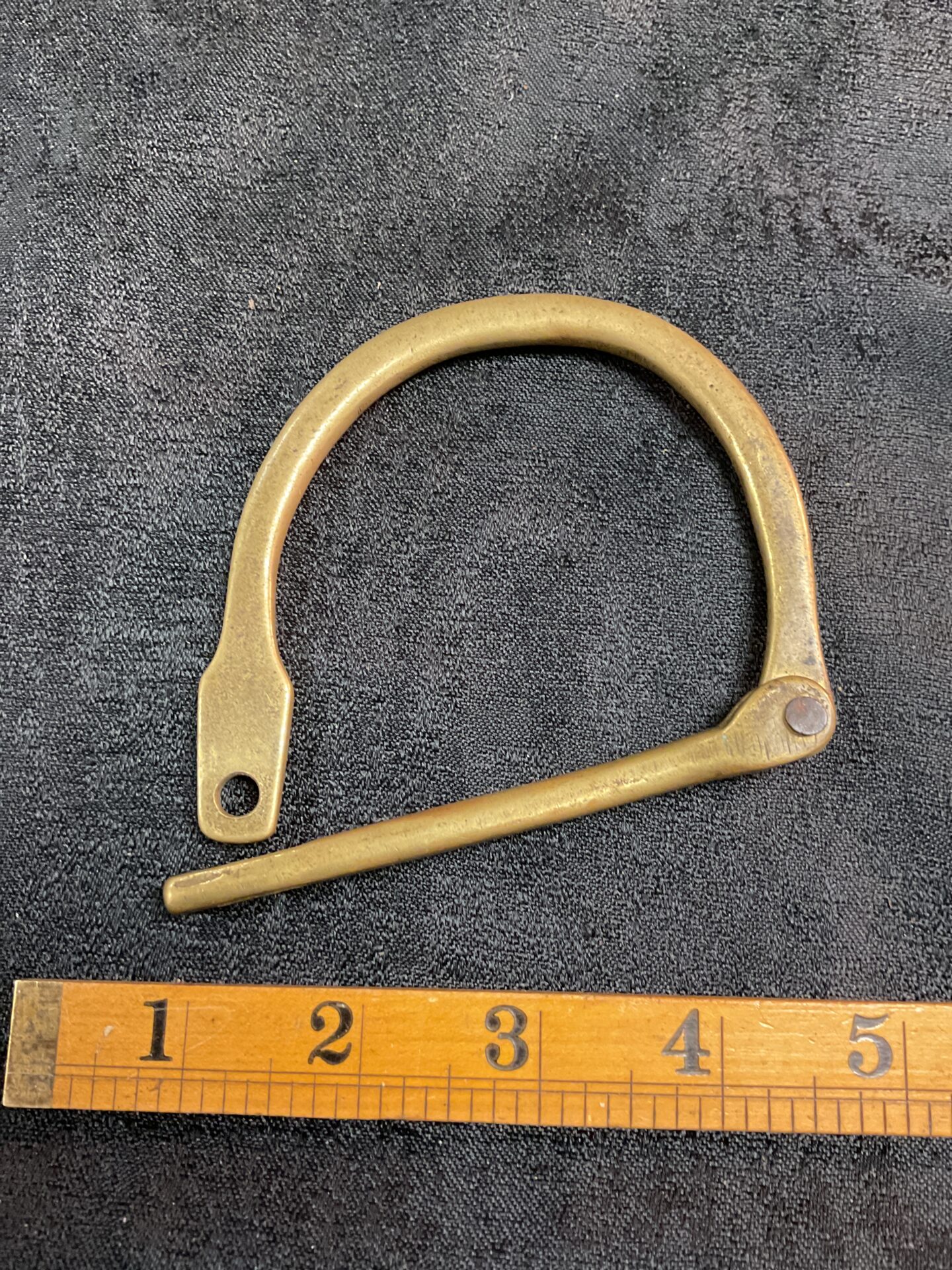 This is a robust brass lock designed for securing kitbags used by the British Army. The lock features a simple, yet effective, locking mechanism and a sturdy construction, typical of military-grade hardware. Its design allows for easy attachment to canvas or leather kitbags, providing a secure closure during transport and storage.