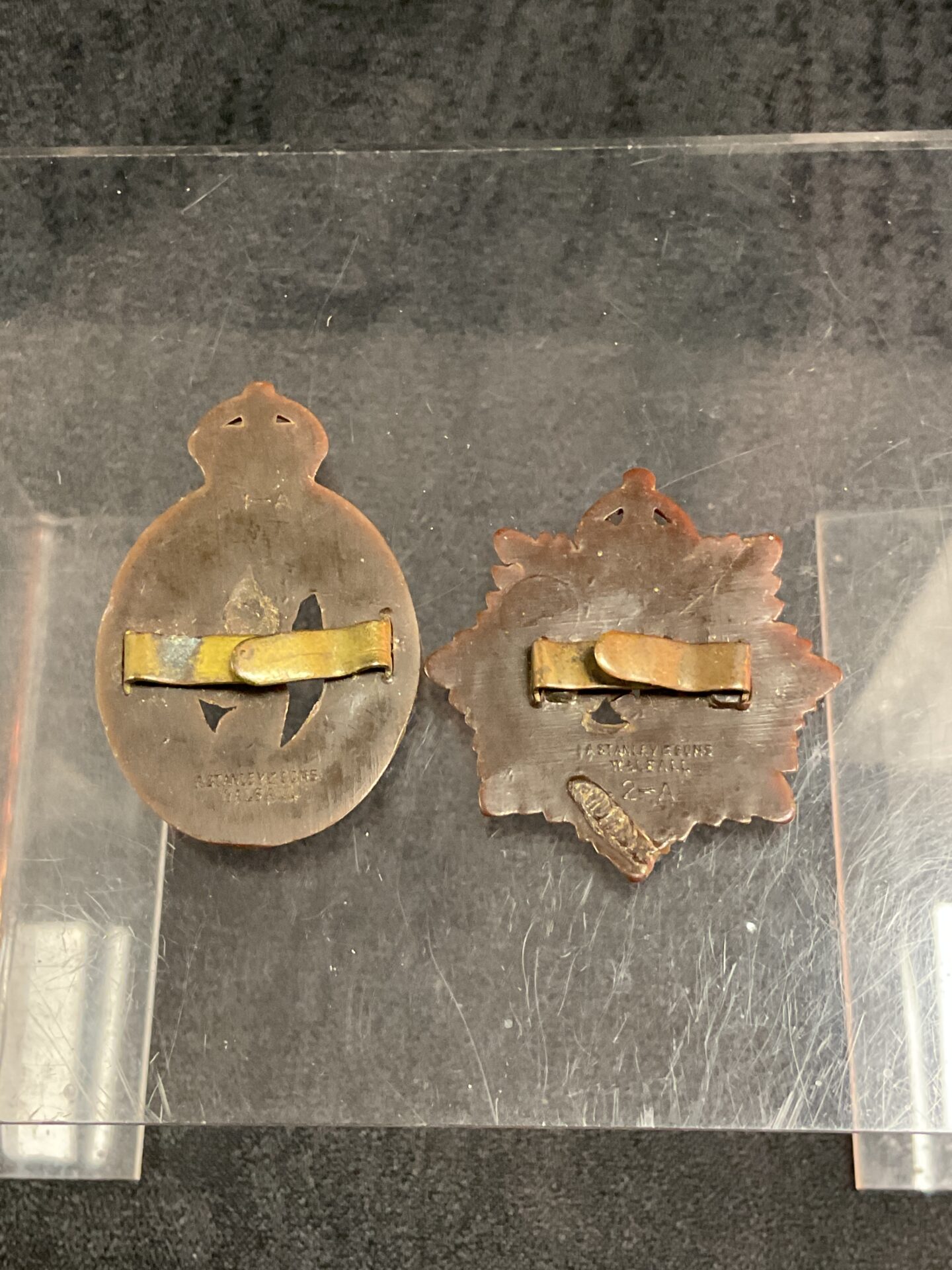 Both badges are in good condition for their age, displaying the expected wear and tear consistent with being vintage military items. While not pristine, they retain their shape and detail well, making them desirable for collectors of British military insignia. These economy badges are increasingly sought after by collectors due to their historical significance and relative scarcity compared to their metal counterparts.