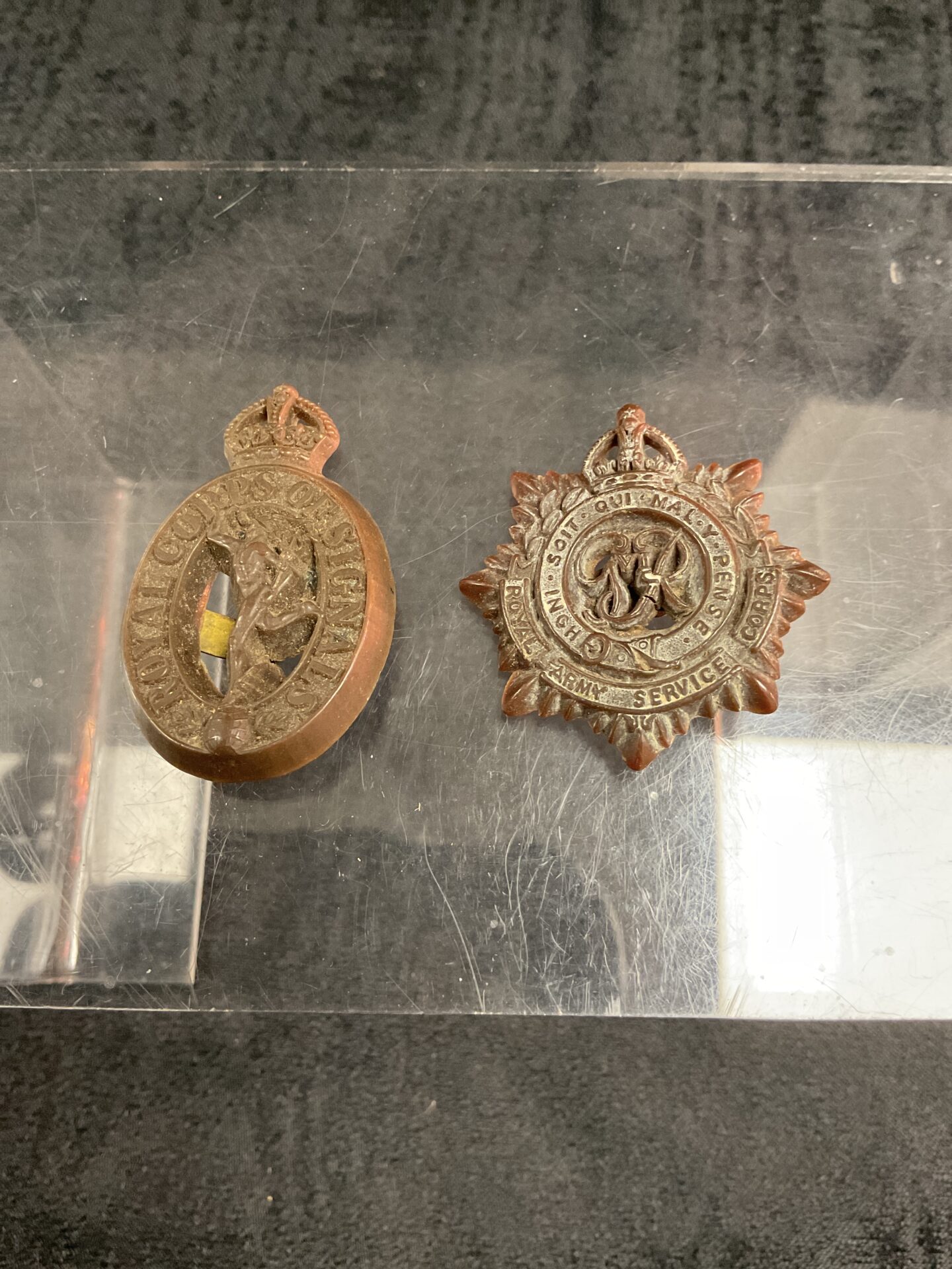 These are two British WWII economy cap badges, one for the Royal Corps of Signals and the other for the Army Service Corps. These badges were manufactured from plastic during the war years as a cost-saving measure, replacing the more traditional brass or white metal versions. They represent a fascinating piece of wartime history and are indicative of the resourcefulness employed during the conflict.