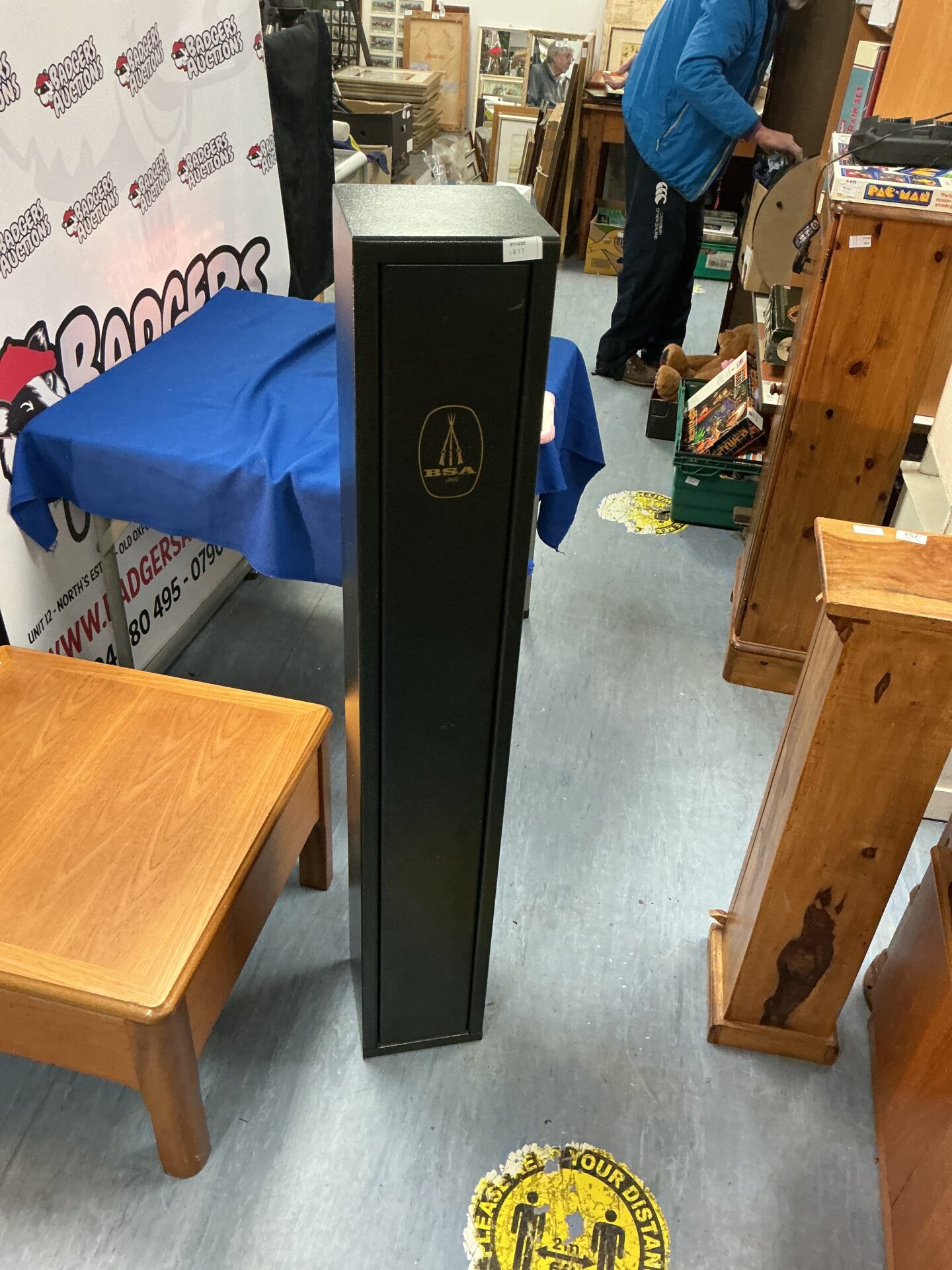 This is a BSA gun case, designed for the safe storage and transport of firearms. The case features a robust construction, likely made of wood and covered in a durable material. It includes key-operated locks for security, and is designed to protect the contents during travel or storage.