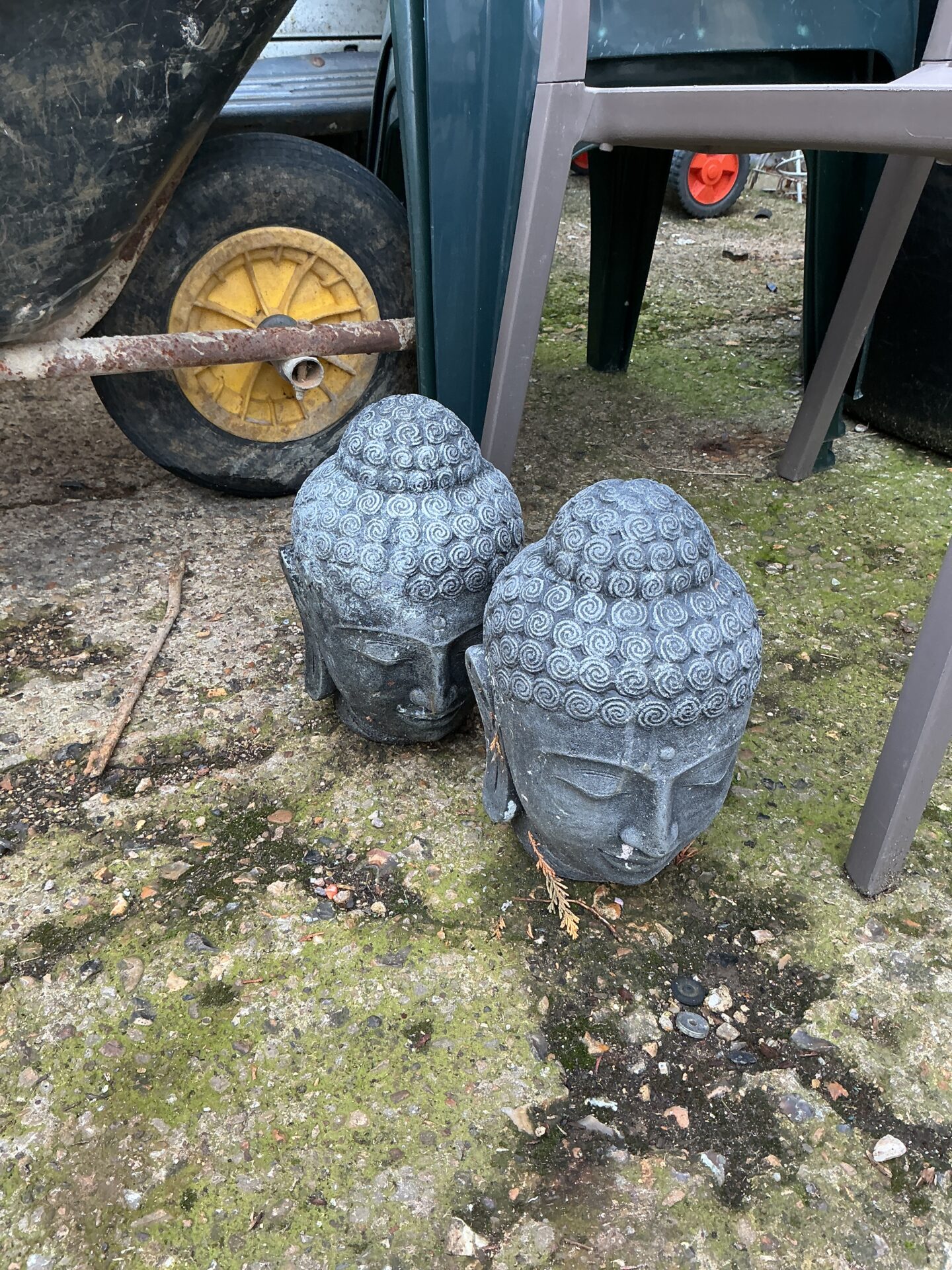 These are two weathered Buddha head garden ornaments, designed to bring a sense of serenity to outdoor spaces. Crafted from a cast material, they depict the serene features of Buddha, with detailed facial features and a traditional hairstyle. These ornaments are intended for display in gardens, patios, or other outdoor settings, adding a touch of Eastern-inspired tranquility.