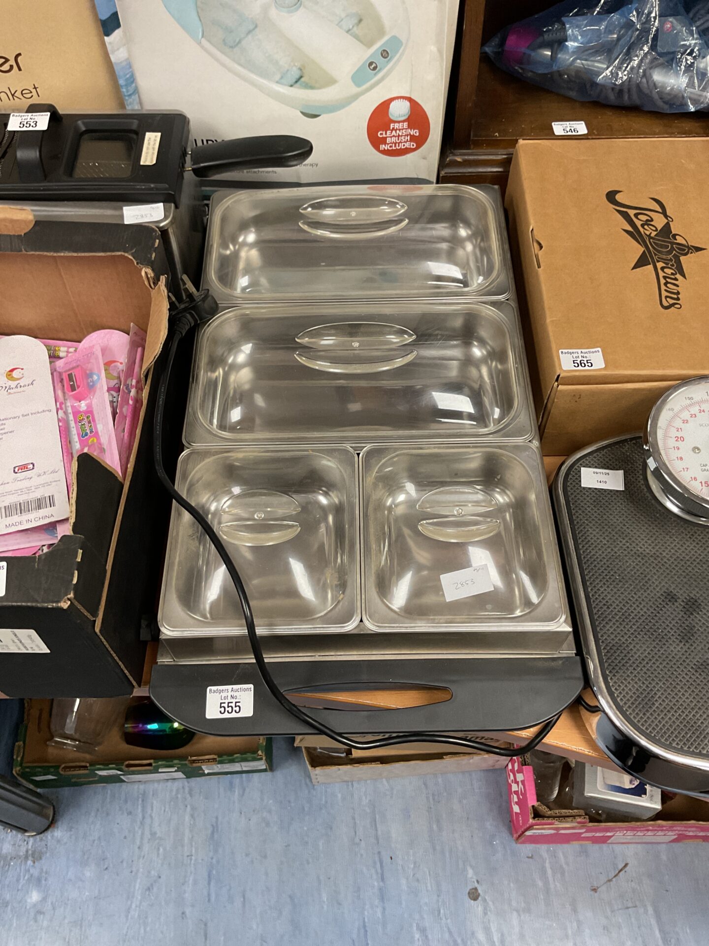 This is a stainless steel buffet server, designed for keeping food warm during service. It features multiple removable stainless steel pans, ideal for holding various dishes. This unit is likely intended for commercial use, such as in restaurants, catering events, or large gatherings, offering a convenient way to maintain food temperature and presentation.
