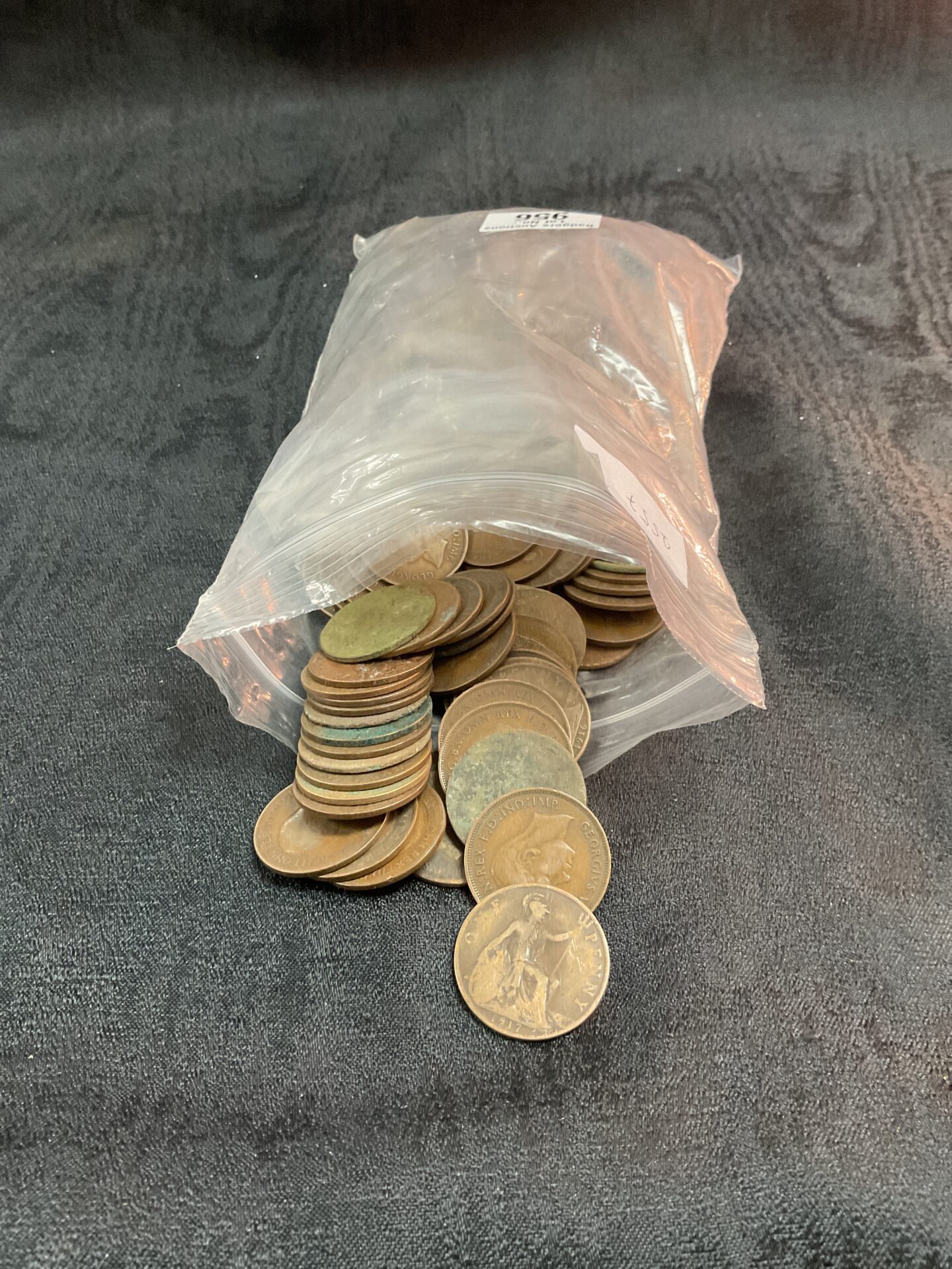 This lot consists of approximately 3,000 pennies, presented in a large plastic bag. These are standard US pennies, likely spanning several decades of minting. The lot offers a substantial quantity of copper coins for collectors, crafters, or those seeking bulk materials.