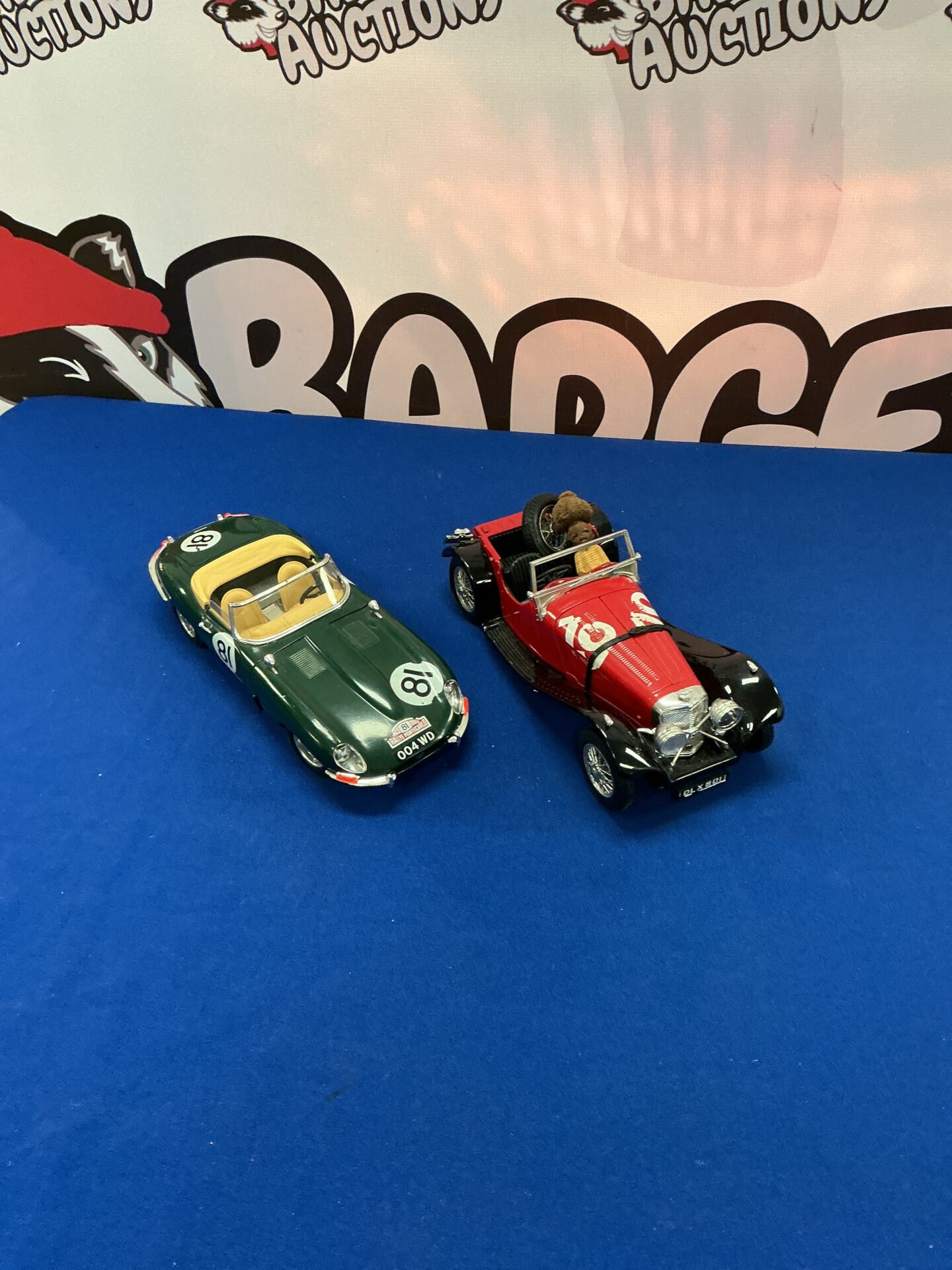 This lot features two 1:24 scale Burago model cars, both depicting Jaguar vehicles. One is a classic E-Type, finished in a striking British Racing Green, while the other is a sleek XJ220 in a vibrant red. These diecast models showcase detailed interiors and exteriors, capturing the essence of these iconic sports cars.