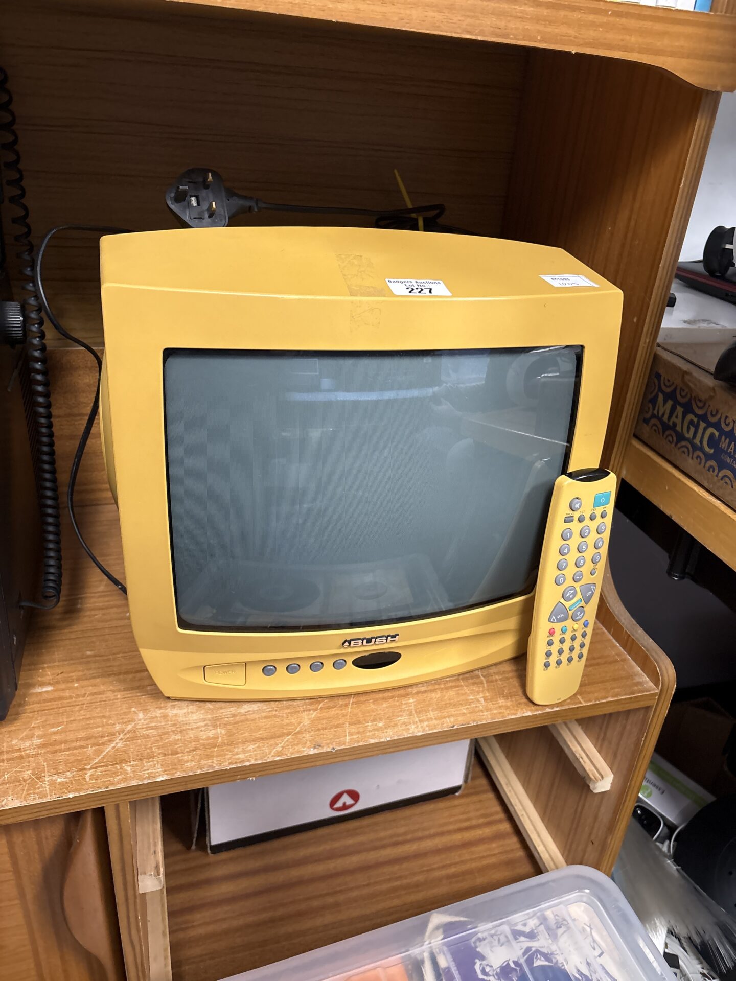 This is a vintage Bush CRT television, model number 1433YEL2. It features a compact design, making it suitable for smaller spaces or as a nostalgic display piece. The television is finished in a bright yellow casing, typical of designs from the era, and includes its original remote control.