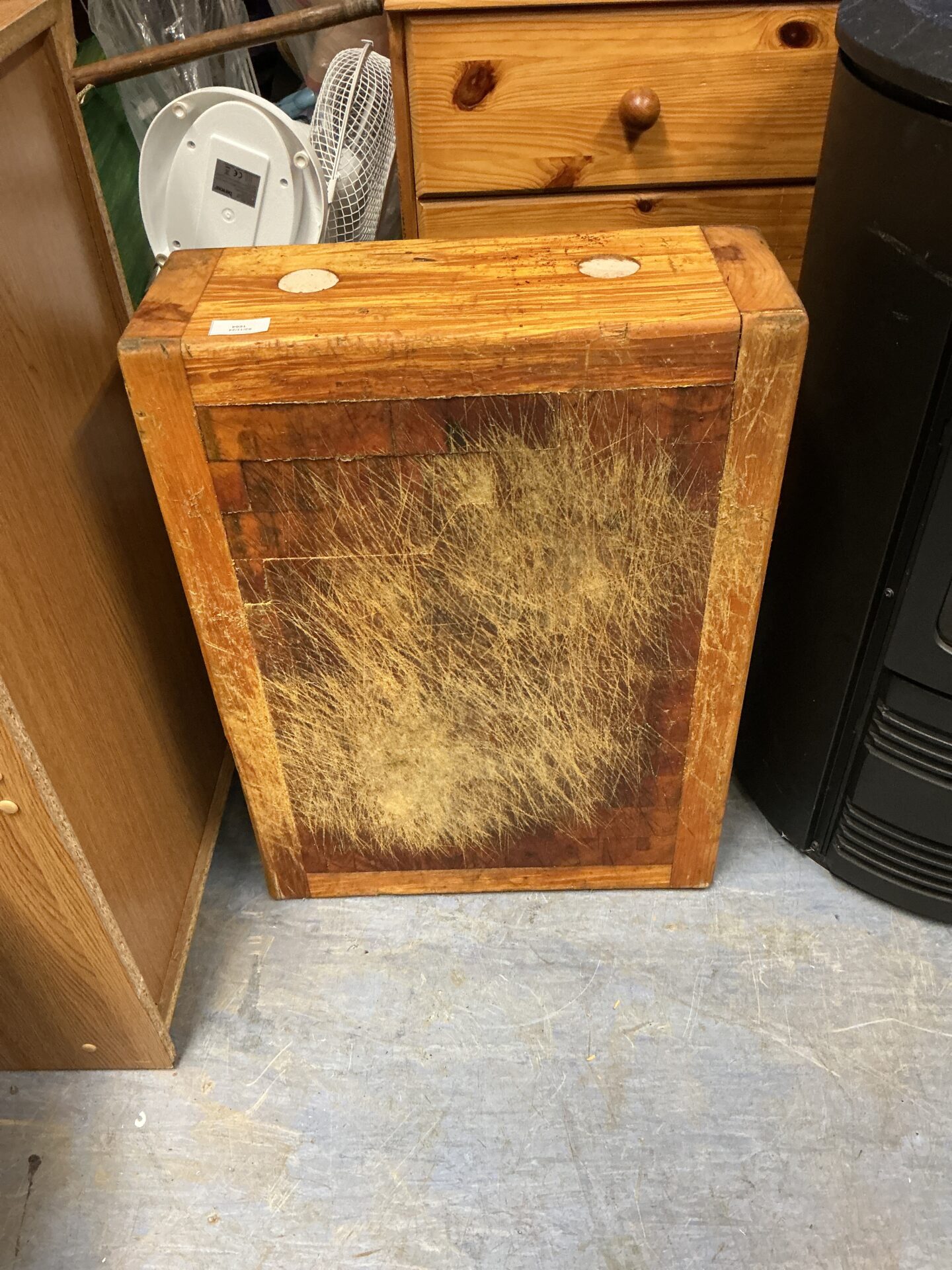 This is a traditional butcher block, measuring 24” x 18”. Constructed from solid wood, it presents a robust surface ideal for food preparation or as a unique kitchen feature. The block’s substantial size and construction suggest it was designed for heavy-duty use, offering a durable and stable workspace.