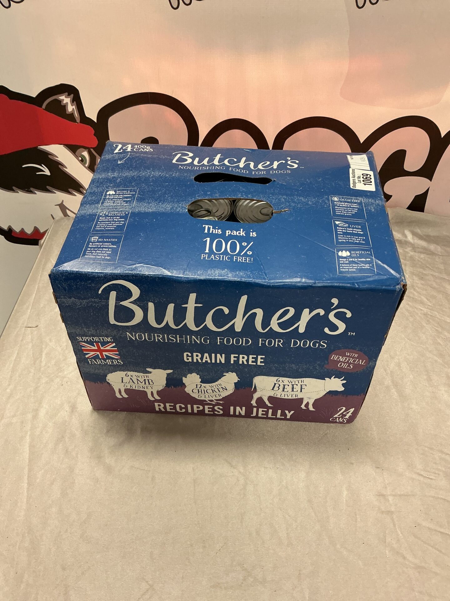 This lot comprises 24 cans of Butchers dog food. The packaging indicates a focus on nourishing recipes for canine companions. The cans are designed for convenient feeding and to provide a balanced diet for dogs.