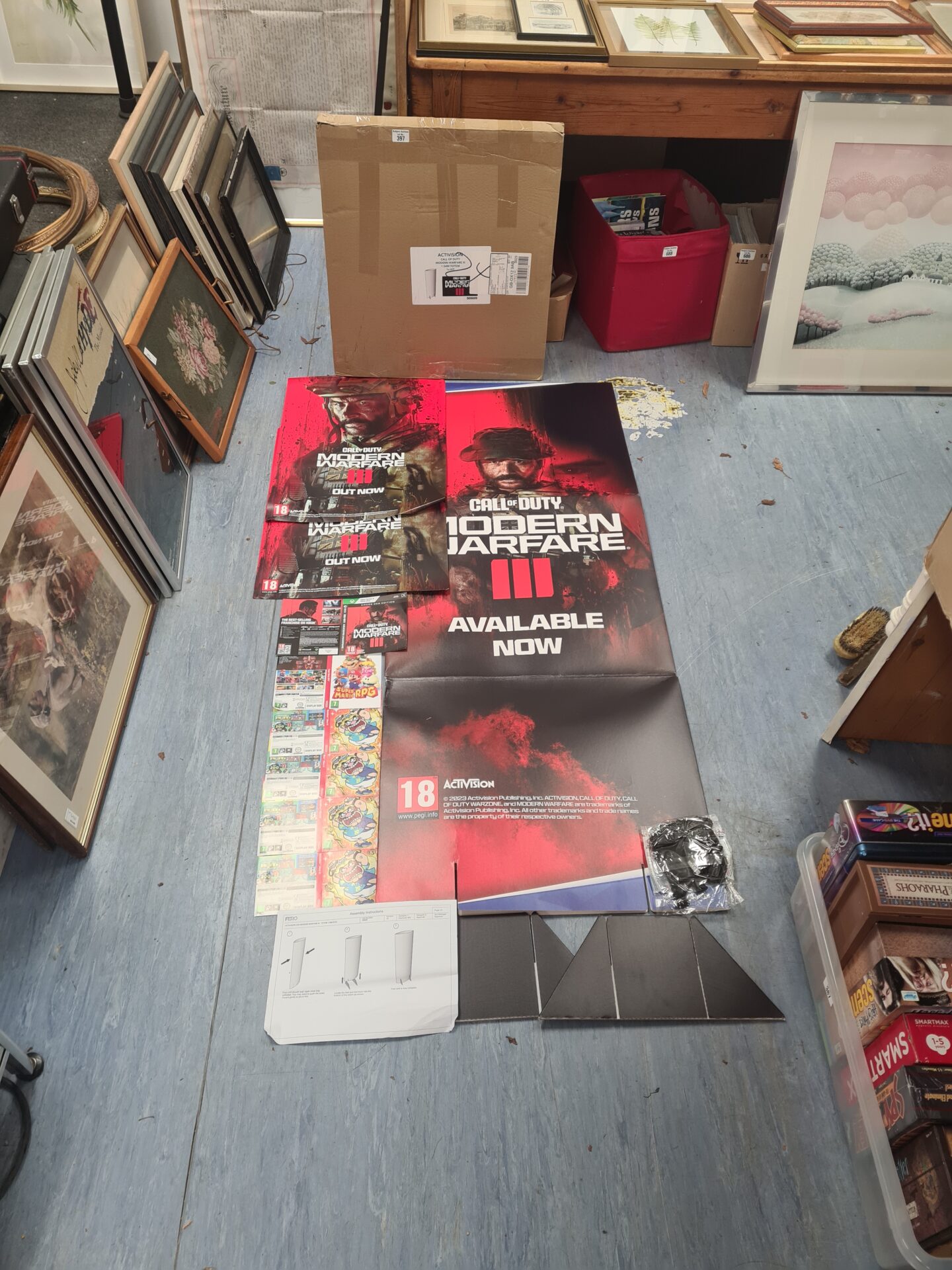 The condition of the items within this lot appears varied, with some showing signs of handling and storage. This lot is of interest to collectors of video game memorabilia, marketing ephemera, or fans of the Call Of Duty series. The inclusion of promotional materials provides a unique insight into the game’s launch and marketing campaign, making it a desirable addition to any collection.