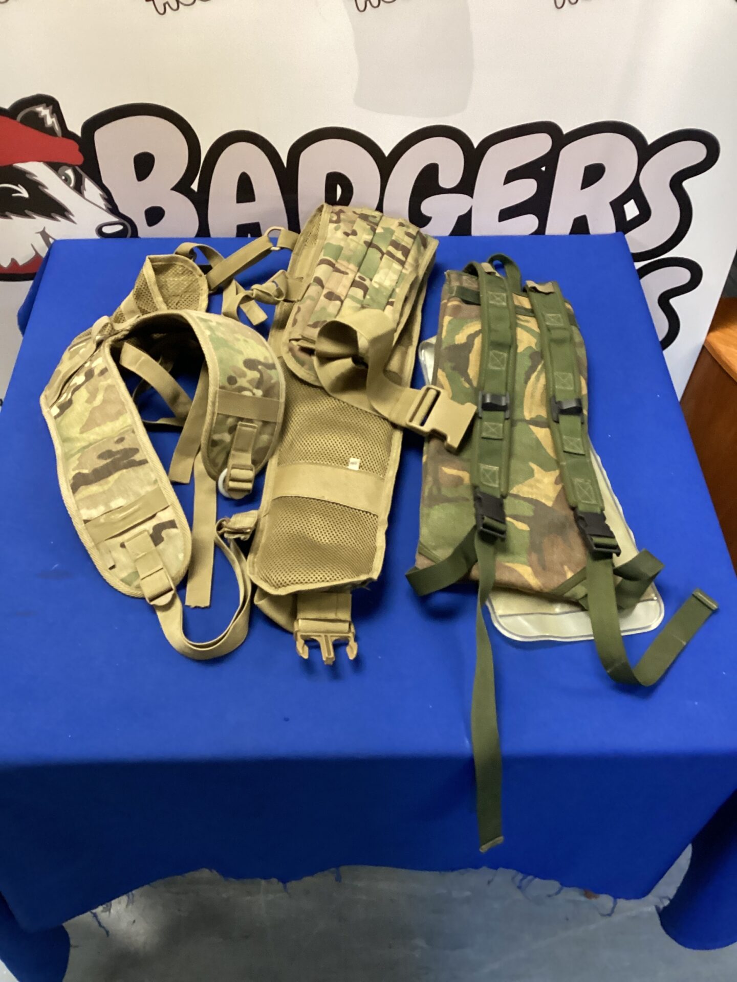 This lot features a camelback hydration pack integrated with a tactical combat vest. The vest is constructed with durable nylon webbing and features MOLLE (Modular Lightweight Load-carrying Equipment) loops for attaching additional pouches and accessories. The hydration pack is designed to carry water and allows for hands-free hydration during activity.