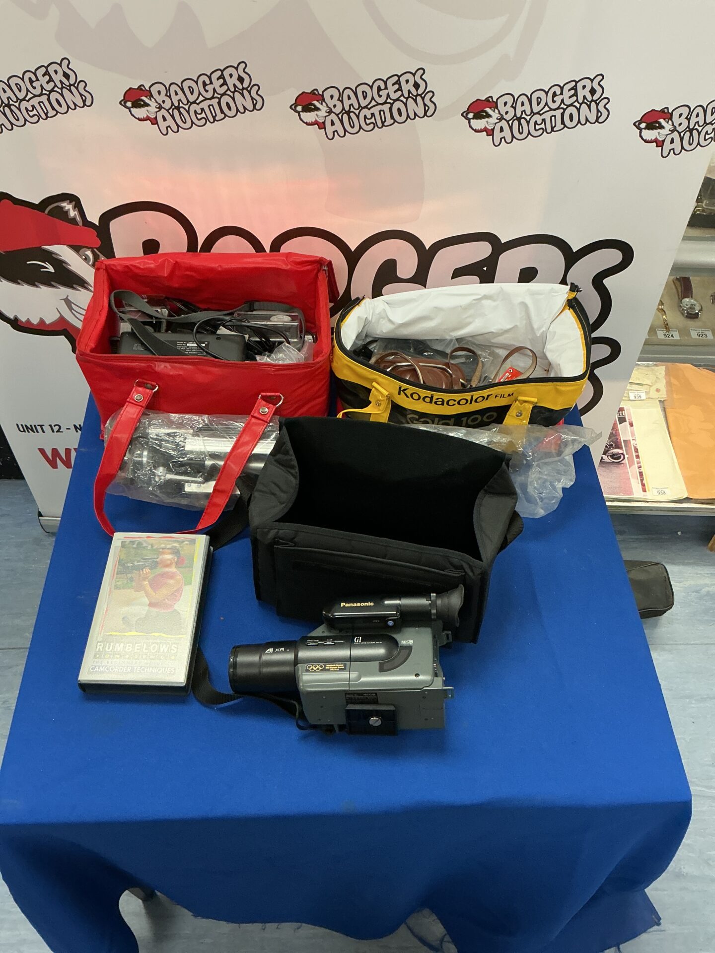 This lot comprises a selection of photographic equipment, including a Panasonic camera. The camera appears to be a digital model, designed for capturing still images and potentially video. Included is a dedicated camera bag, offering protection and portability for the equipment. This lot represents a collection of tools for the photography enthusiast or collector.