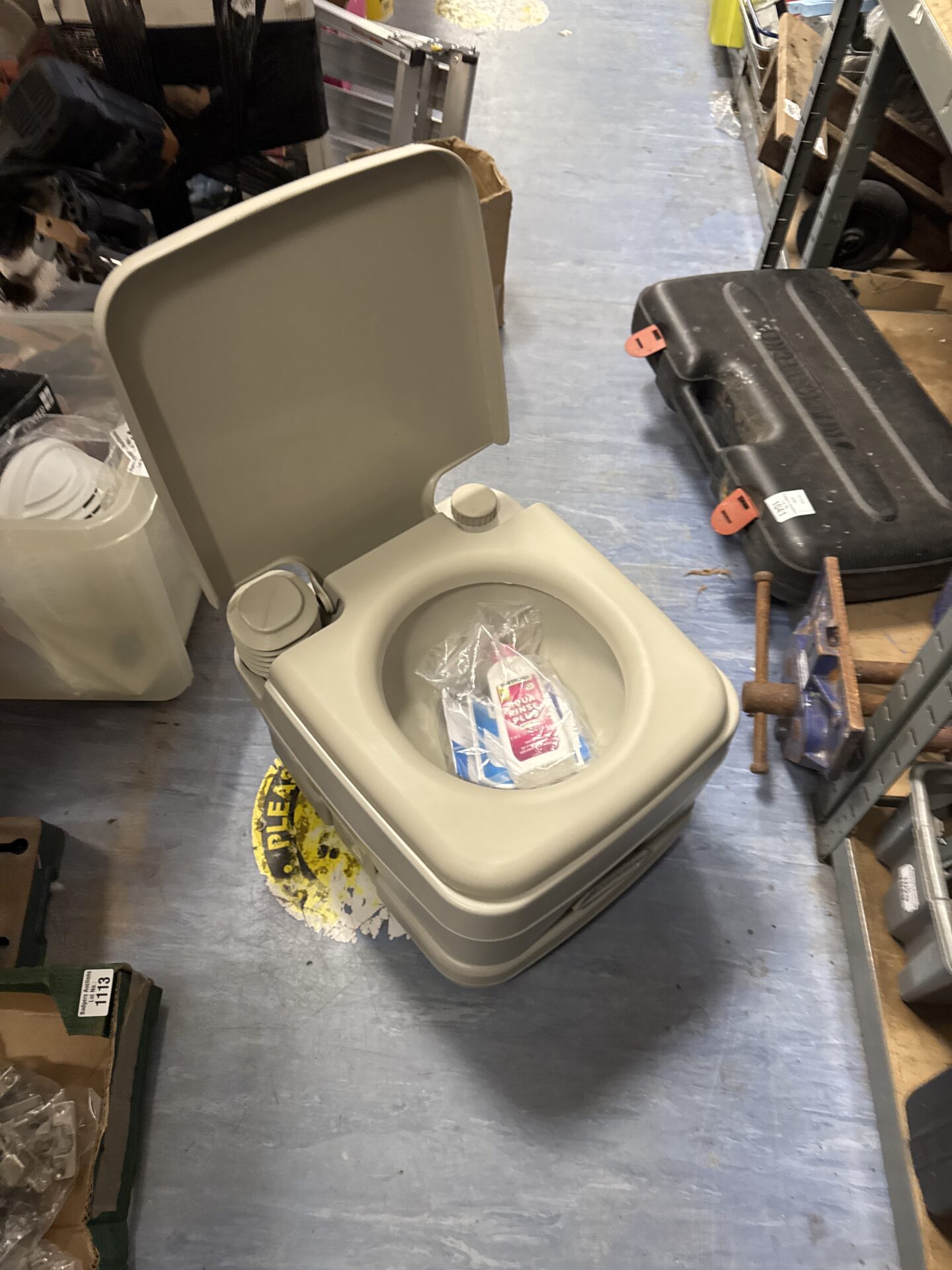 This camping toilet appears to be in good used condition, ready for its next adventure. While showing signs of previous use, it remains fully functional and a practical addition to any outdoor enthusiast’s kit. It’s a great option for those seeking a reliable and portable toilet solution, and could be a useful addition to a camping or caravanning collection.