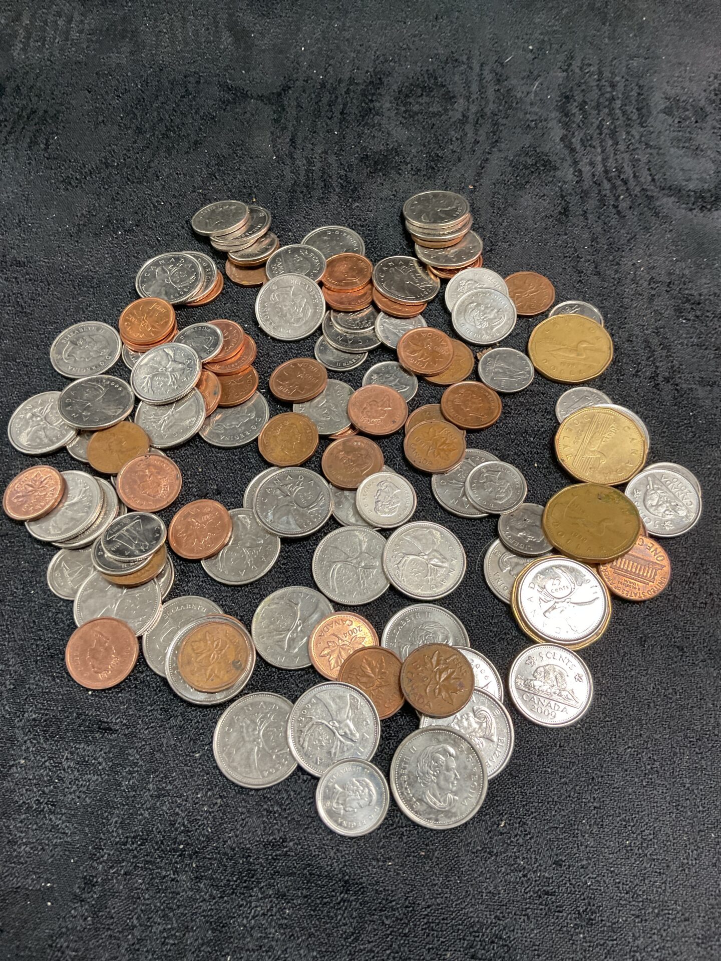 The coins exhibit varying degrees of wear and circulation, consistent with having been used as currency. While not necessarily pristine, this lot presents an opportunity for collectors interested in building a quantity of Canadian coins or for those seeking currency for counting or other purposes. The mix of denominations and potential for older issues may appeal to numismatists or hobbyists.