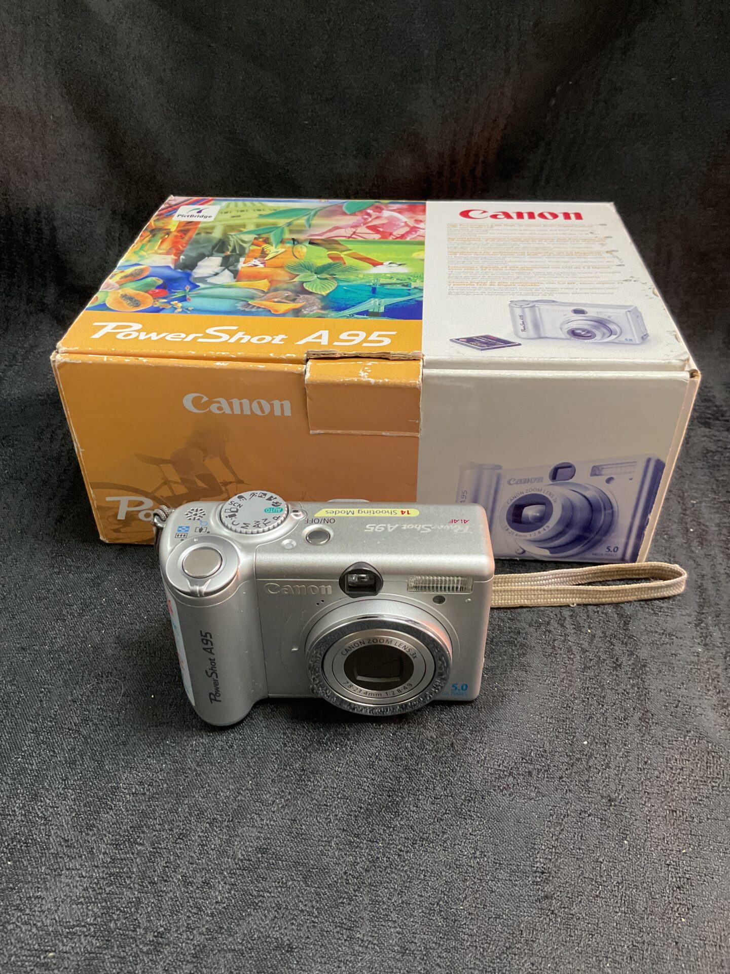 This Canon PowerShot A95 is presented with its original box and instructions. The camera’s condition should be assessed by the buyer, as no functionality is guaranteed. This camera may appeal to collectors of vintage digital cameras, enthusiasts of early digital photography, or those seeking a nostalgic piece of technology.