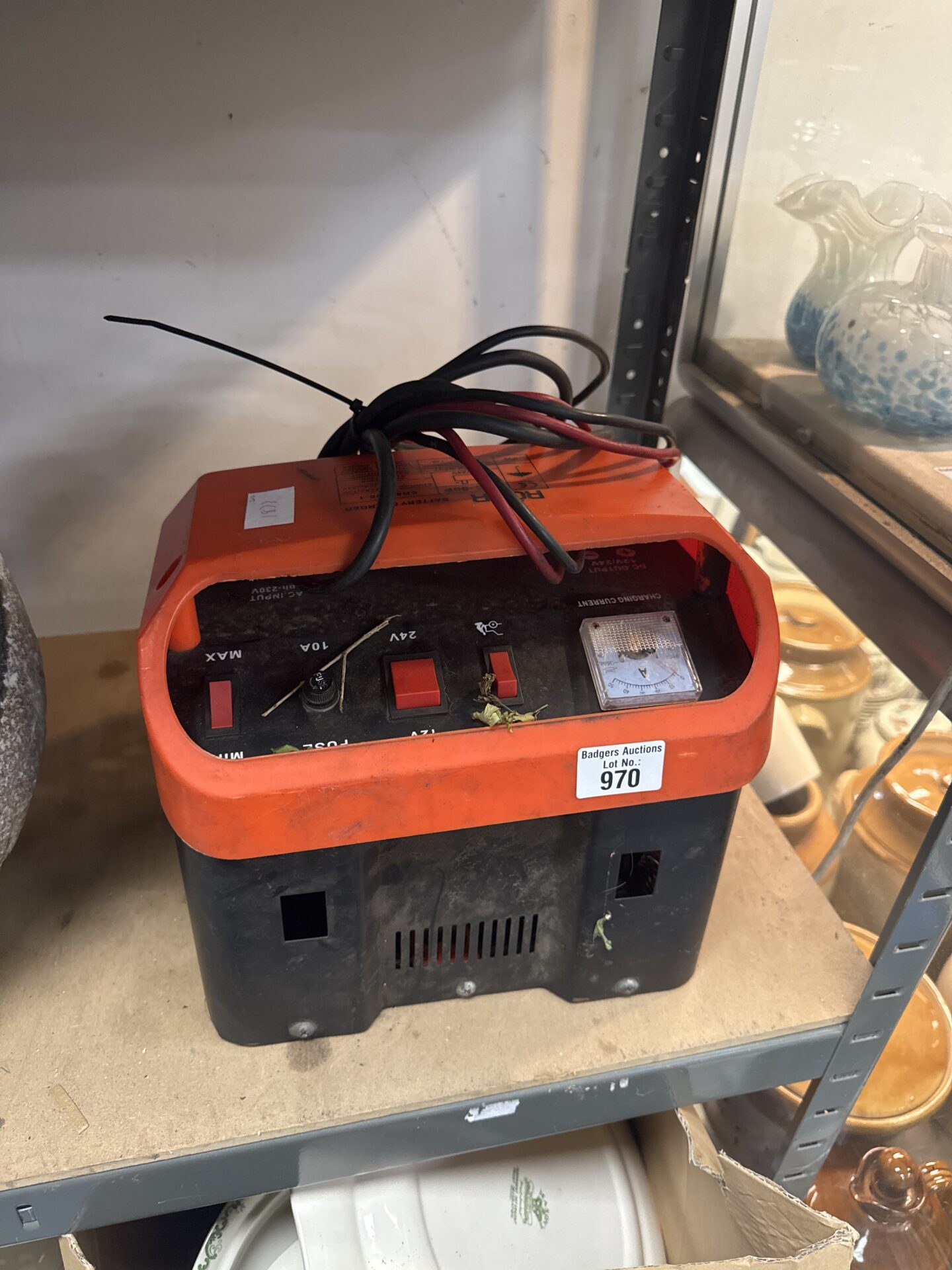 This is a vintage Rohr 12v car battery charger, designed for maintaining and charging lead-acid batteries in vehicles. The charger features a robust construction and a simple, functional design typical of its era. It includes leads for connecting to the battery terminals and is switchable for both 6v and 12v systems.