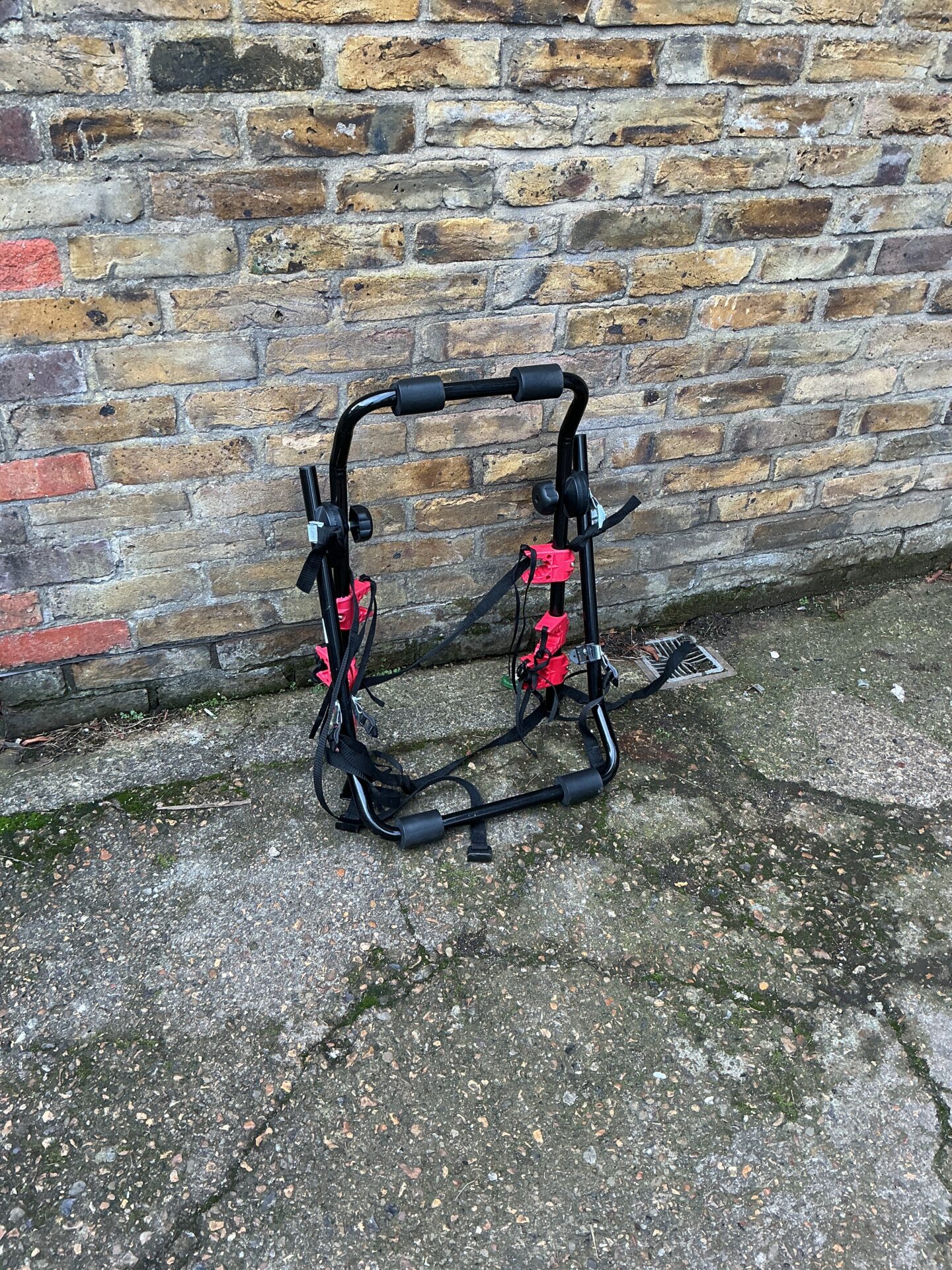 This bike rack shows signs of use and wear, consistent with being a functional item. It may be of interest to those seeking an affordable solution for transporting bicycles, or to collectors of vintage car accessories. Please examine the images carefully to assess its condition before bidding.