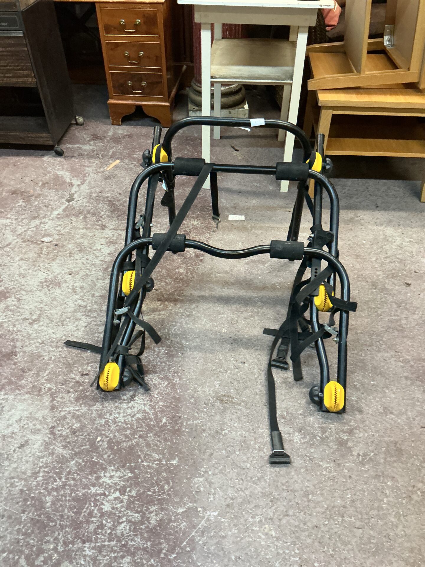 This bike rack shows signs of prior use and may benefit from cleaning. The metal frame appears structurally sound, though some cosmetic wear is visible. This rack could be of interest to cyclists seeking an affordable and functional solution for transporting bicycles, or to collectors of vintage automotive accessories.